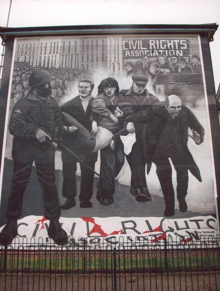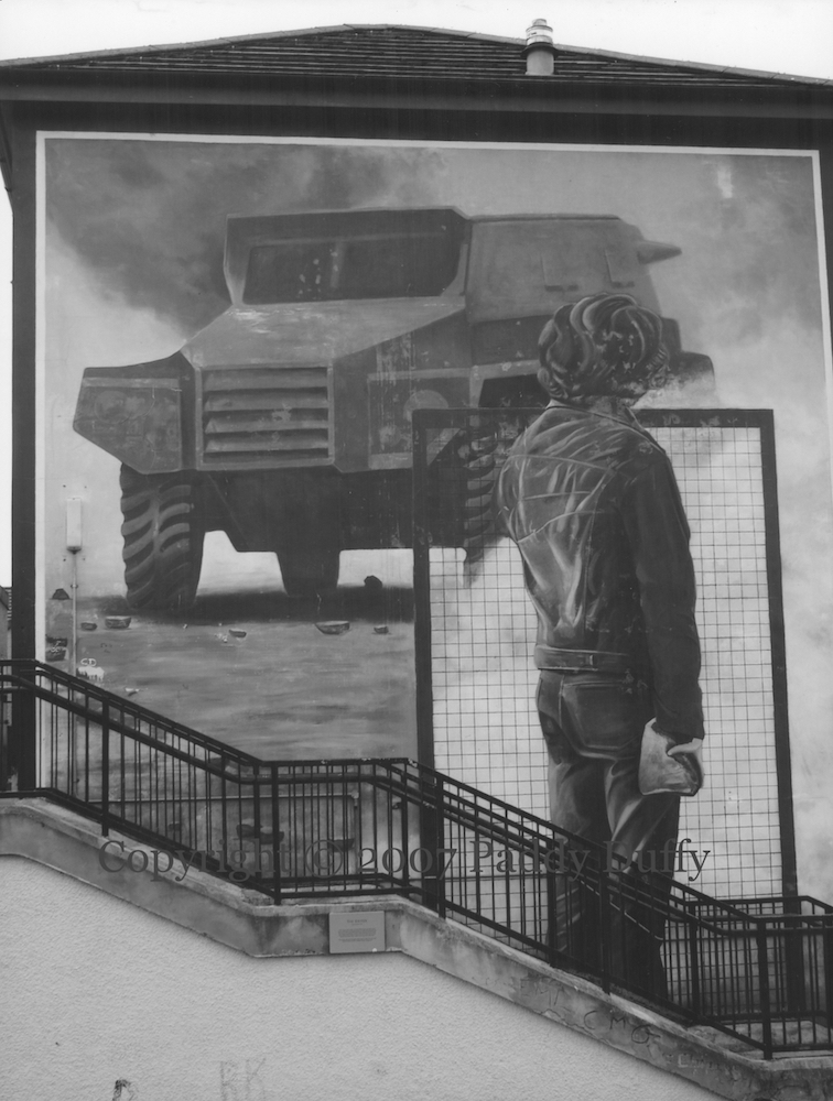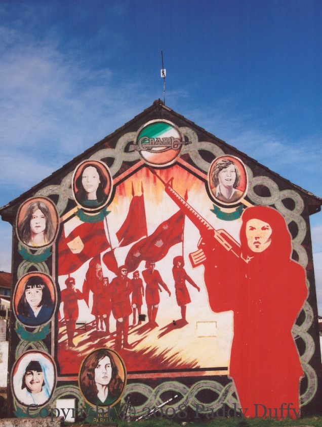 Various images and posters from 1980 and 1981 are reproduced. Along the top, we see (l-r) a soldier is confronted at the top of Springhill (image at Irish Times), “Wanted for murder [and torture of Irish prisoners]” (image at MSU), “Mothers hunger”, “Blessed are those who hunger for justice“, “Where there is oppression there is resistance”, Armagh hunger-striker Mary Doyle.