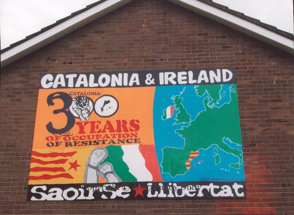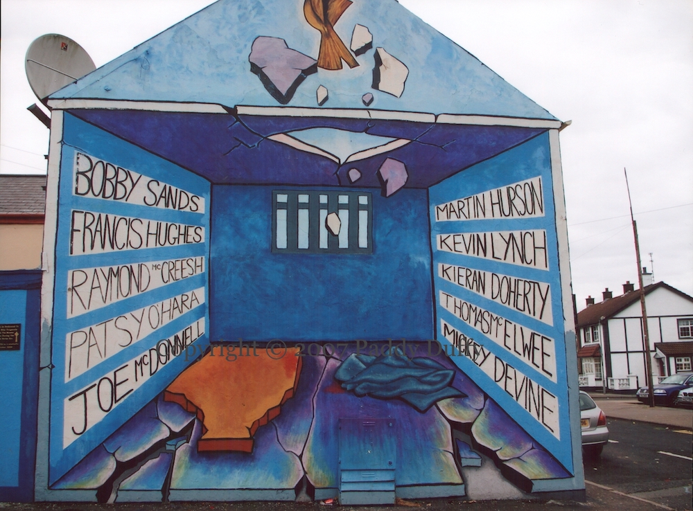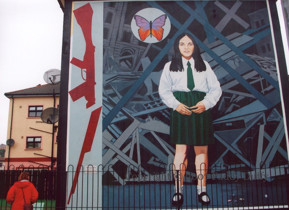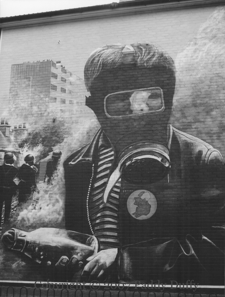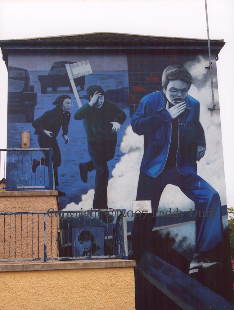 ‘The Runner’ is the final mural painted by the Bogside Artists in the series that would in 2007 be collectively given the name The People’s Gallery (the John Hume mural would be added in 2008). The mural shows youths running from CS gas in Creggan. There are portraits of Manus Deery (see his Bogside plaques) and (obscured) Charles Love in the bottom left; the plaque to Love in the centre is retained.