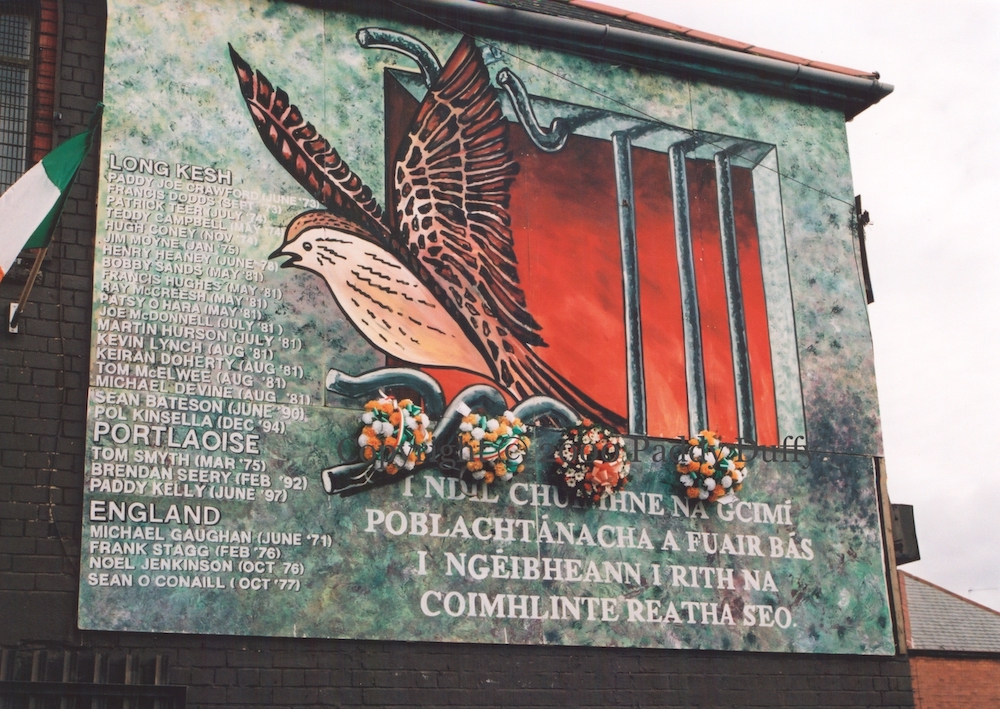 “I ndıl chuımhne na gcımí poblachtanacha a fuaır bas ı ngéıbheann ı rıth na coımhlınte reatha seo.” A lark bursts through prison bars of Long Kesh, Portlaoise, and prisons in England, in which republicans have died from the 70s to 90s.