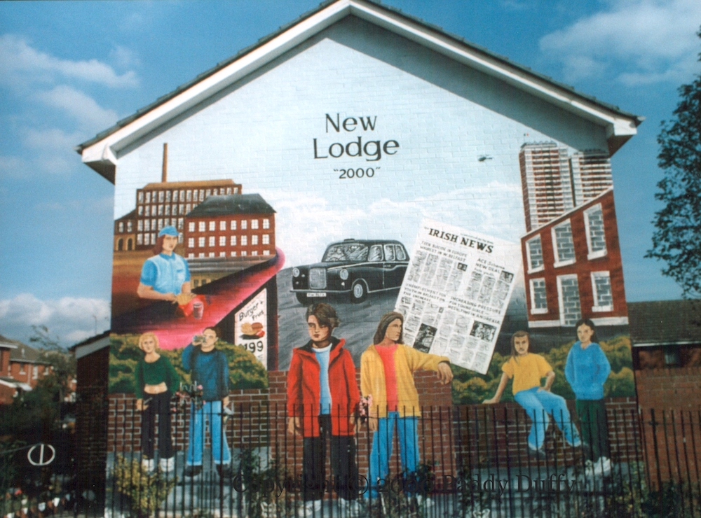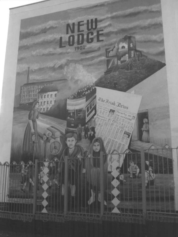 This pair of murals, on the New Lodge Road, Belfast, contrasts life for young people in the black-and-white “1900s” to life in colourful “2000”. Instead of working (and dying – in the headlines from the Irish News) in mills, they work in fast-food restaurants and drive black taxis (and suffer unemployment, suicide, and anorexia – again, in the newspaper), and instead of playing in the streets and wrapping themselves in blankets, they sit on walls and drink.