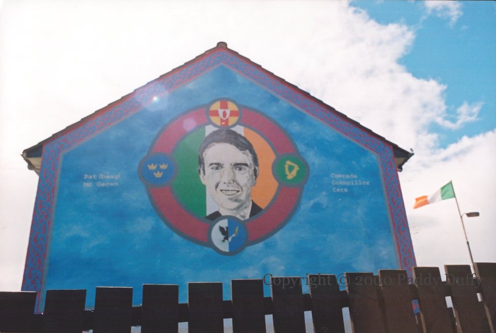 “Comrade, councillor, cara [friend].” Pat McGeown was a 1981 IRA hunger striker whose family intervened when he lapsed into a coma. After his release in 1985 he also worked for Sınn Féın and was elected to Belfast City Council in 1993. He died in 1996 of a heart attack. He is also remembered by a plaque on the Sınn Féın office on Falls Road.