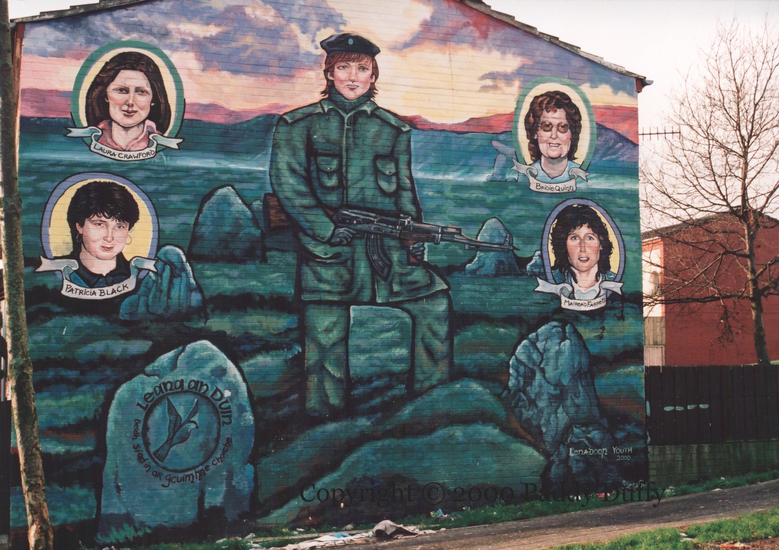 “Leanna An Dúın – Beıdh sıad ın ár gcuımhne choíche.” Local female IRA volunteers Laura Crawford, Patricia Black, Bridie Quinn, Maıréad Farrell and a generic female volunteer with assault rifle on manoeuvres in an Irish landscape strewn with standing stones.