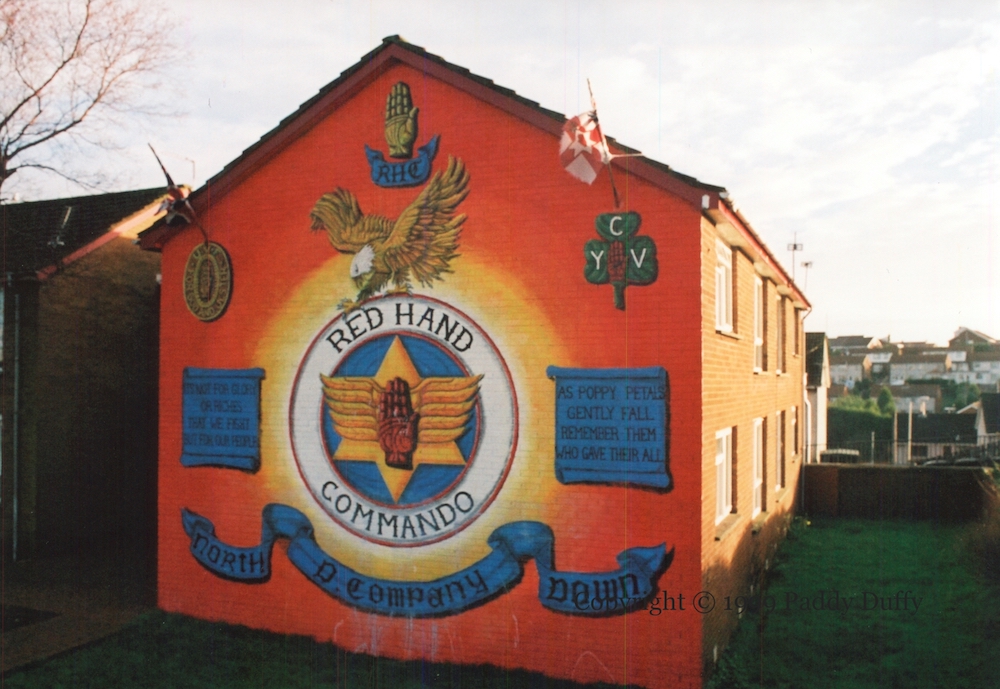 “It is not for glory or riches that we fight but for our people” (based on the Declaration Of Arbroath) is familiar in loyalist murals – see e.g. For Freedom Alone) but “As poppy petals gently fall/Remember them who gave their all” here makes a very infrequent appearance. It comes from The UDR Soldier, by John Potter. The mural thus links together the UDR (1970-1992) and D Company of the North Down Red Hand Commando.