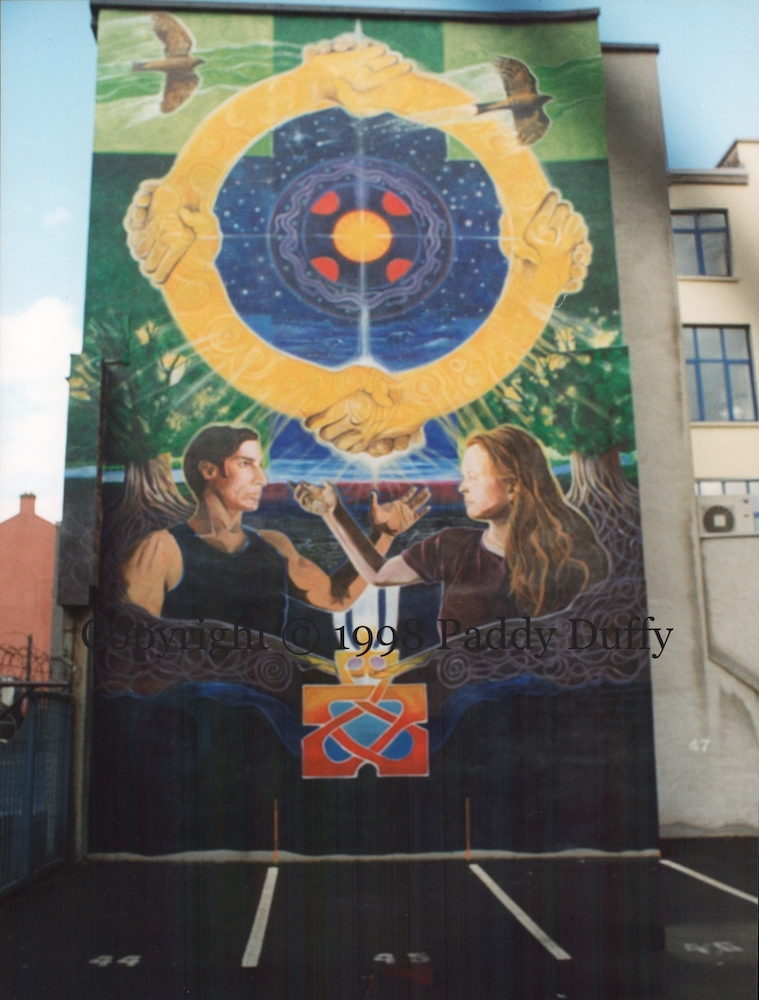 “Ring Of Peace” is a massive, three storey piece in Waring Street, undertaken in 1998 to mark the Good Friday Agreement, by Francisco Letelier (with Jennifer Trouton, Colin McGookin, Marie Thérèse Davis) – here is a shot of the artist working on the piece. The mural shows four double-handed arms clasping each other in a circle against a back-drop of cosmic and nature scenes. In the lower portion, two human figures reach out to each other.
