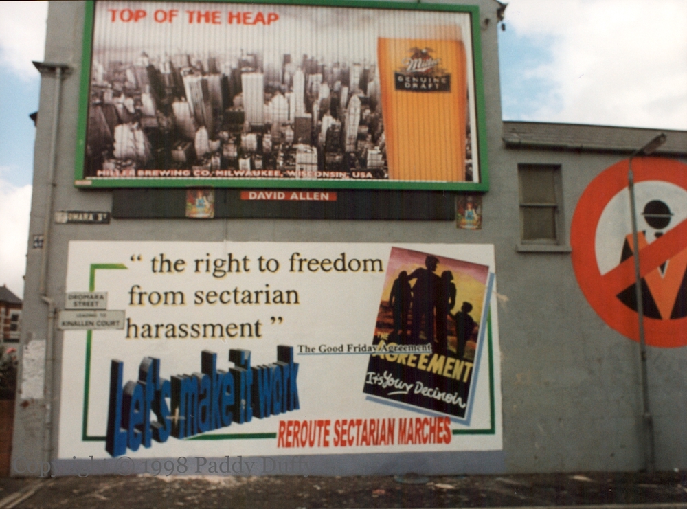 The Belfast or Good Friday Agreement promises “the right to freedom from sectarian harassment” and this mural beseeches the authorities to “let’s make it work” by rerouting “sectarian marches” such as the Orange Order parade on the Ormeau Road.