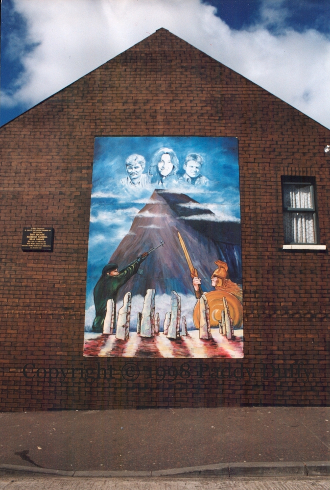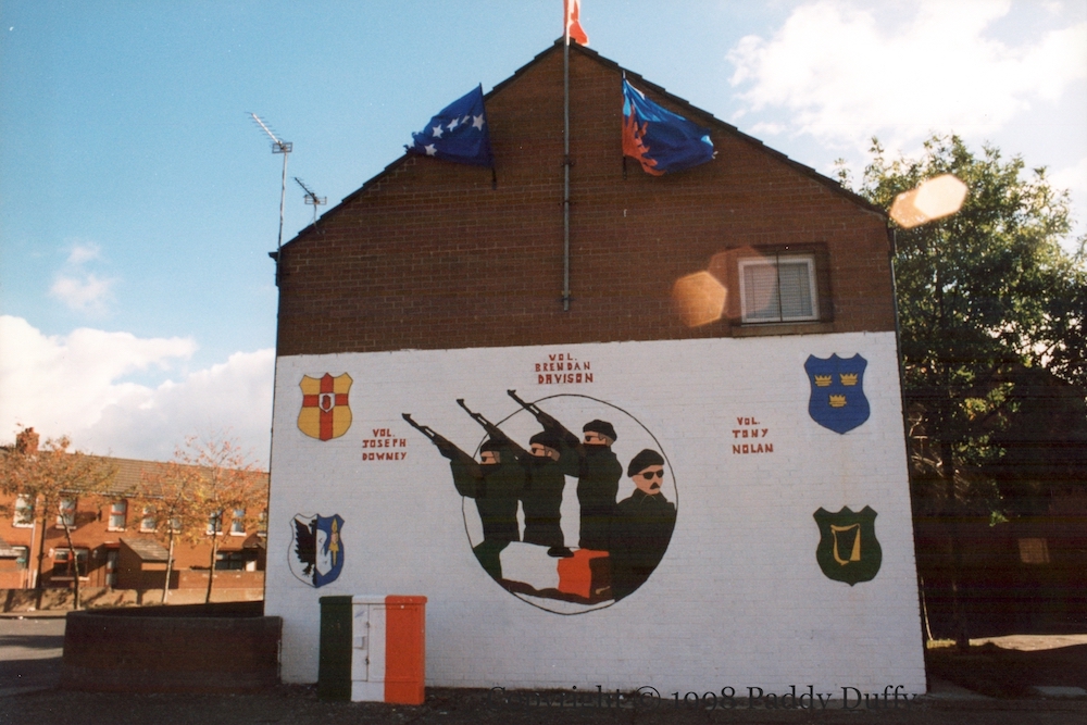 “In the love of our country, some have give[n] something, some have give[n] everything, others have yet to give. Quis separabit. UDA/UFF.” UYM mural with a crudely drawn hooded-gunman. There is “RIRA” graffiti in three places.