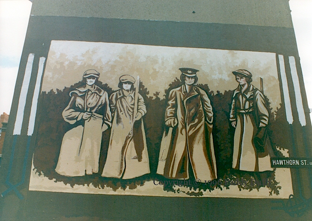 Text would later be added along the bottom reading, “This mural is dedicated to the Women of Cumann Na mBan, Óglaıgh Na hÉıreann & Sınn Féın.” Image “from R[uth] Taillon’s book The Women Of 1916.” Taillon is a Canadian who moved to Belfast in 1980 and has been doing work with the women’s movement in the north and on women’s history – see NVTv.