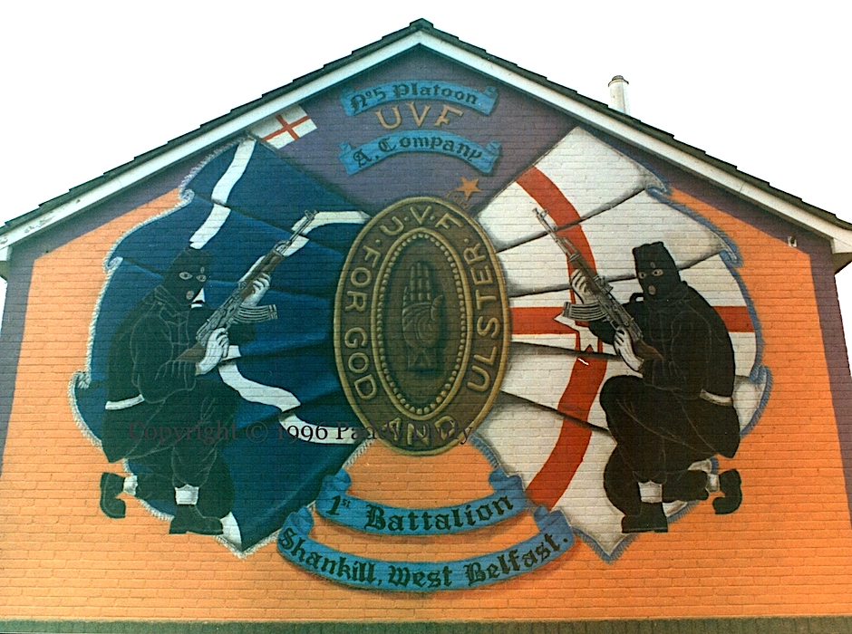 “No 5 platoon, A company, 1st battalion, Shankill, west Belfast”. Hooded gunmen crouch in front of a St Andrew’s Saltire and an Ulster Banner, with a UVF flag on top.