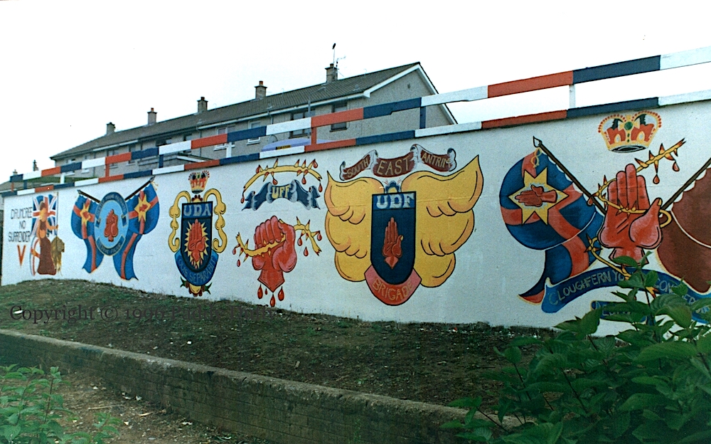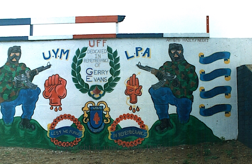 From left to right: “Drumcree – no surrender”, Britannia with a Union Flag and an Ulster Banner shield, Ulster Young Militants, UDA, UFF, “South East Antrim Brigade”, “Cloughfern Young Conquerors [Fb] est. 1973″ with the flag of independent Northern Ireland, and a pair of hooded gunmen flanking a wreath “dedicated in rememberance [sic] of Gerry Evans”. Evans was killed by the INLA on April 27th, 1994, shot at his shop in the Northcott centre. (Lost Lives 3472. Sutton describes Evans as a “civilian”.)
