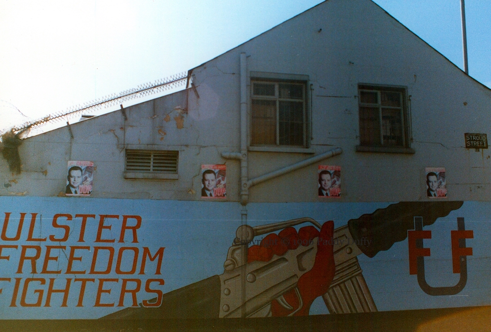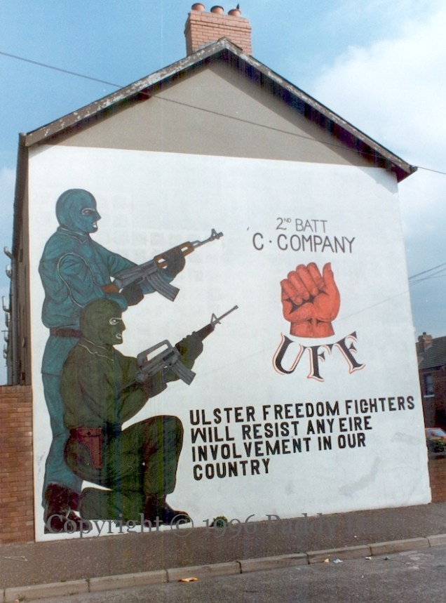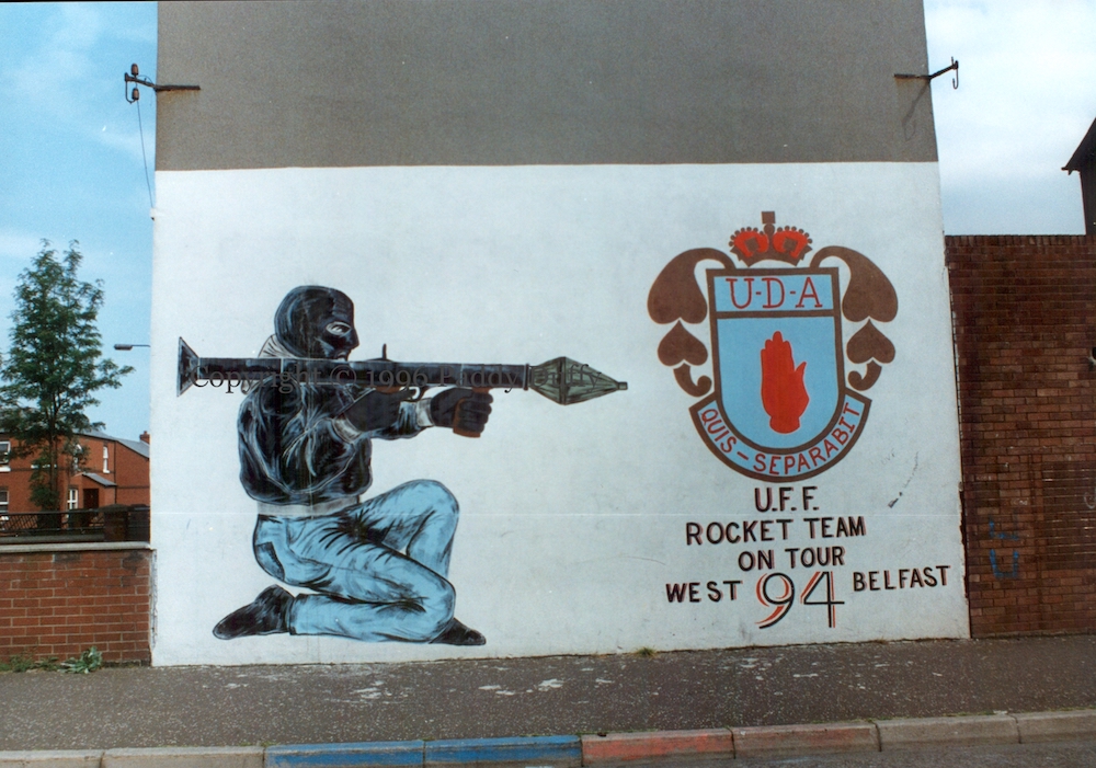 This is a pair of murals in Snugville Street as it was being redeveloped in the mid-1990s. Above, “UFF rocket team on tour, west Belfast ’94”. Johnny Adair’s C company, acquired an RPG-7 rocket launcher and used it in attacks on Connolly House and the Rock Bar in early 1994 (BelTel | UPI). Below, two hooded gunmen with assault rifles: “Ulster Freedom Fighters will resist any Eire involvement in our country”.