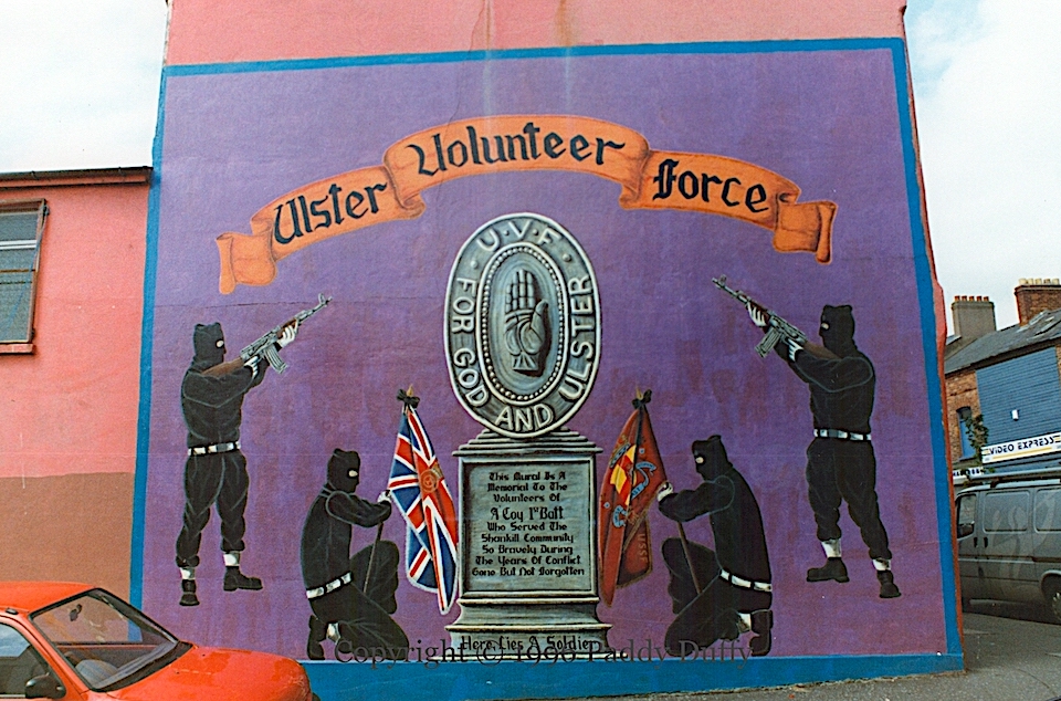 “Present peace now stills our hand/Death no longer stalks our land./Our weapons are silent and shall remain/But if needed, we shall rise again.” UDA volunteers in fatigues hold on to their weapons while the peace process continues. On the right: “In memory of the officers and volunteers of A Coy UDA UFF who unselfishly dedicated their lives in defence of their country. Quis separabit. Feriens tego.”