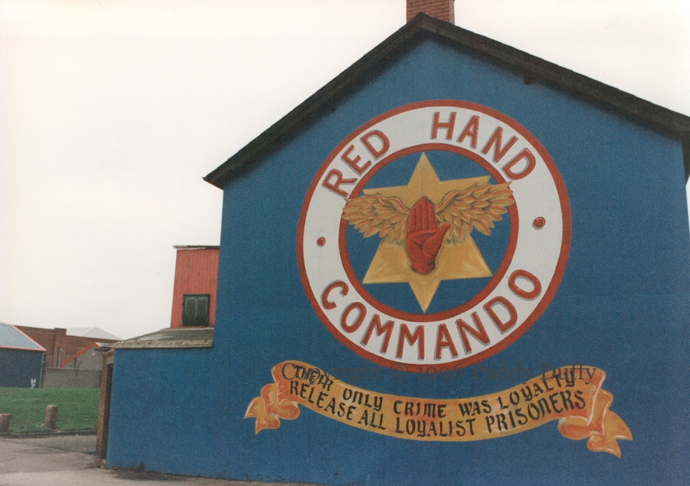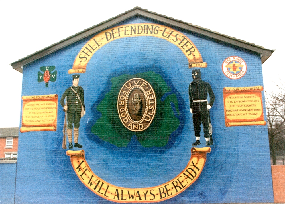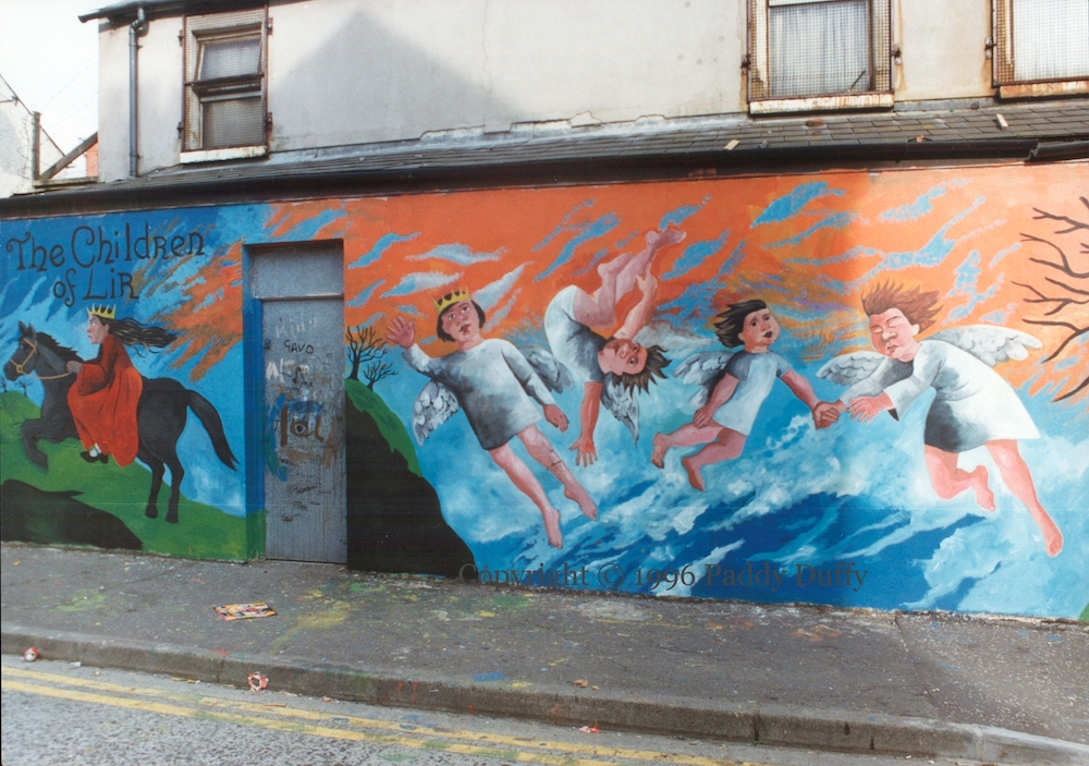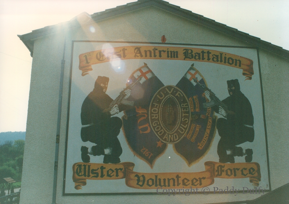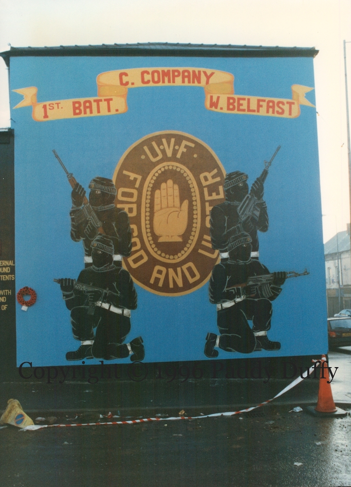The horse comes from Nuada And Indech At The Second Battle Of Moytura by Jim Fitzpatrick but its rider has been changed from a Celtic warrior to an Orangeman wearing the cloak and hood of the Ku Klux Klan. The landscape is from his The Tuatha Dé Assemble For Battle, with stones turned into skulls. For more on Jim Fitzpatrick’s art in murals, see the Visual History page.
