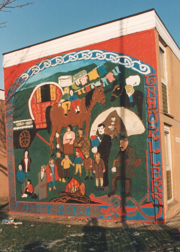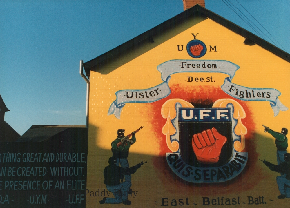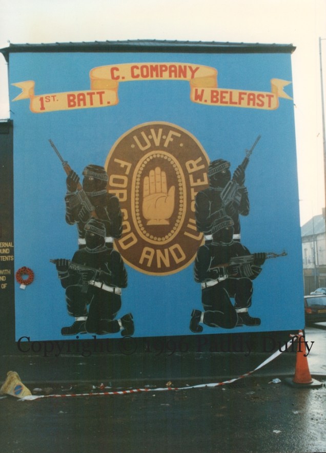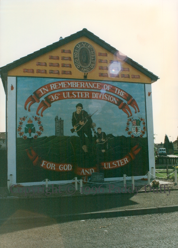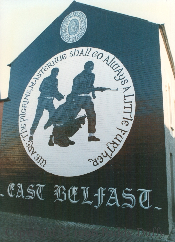 This Falls Road board is a comment on the “traditional routes” taken in Garvaghy (Portadown) and Ormeau (south Belfast) and other small towns (Enniskillen, Dunloy, Castlederg, Ros[s]lea, Keady, and Bellaghy) by the Orange Order – which now pass through CNR areas.