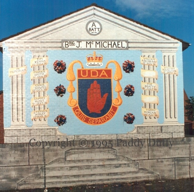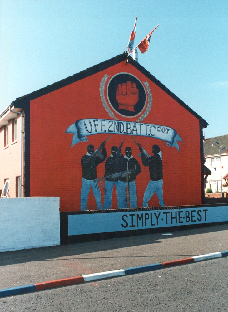 Tina Turner’s cover (youtube) of Bonnie Tyler’s song “The Best” reached #5 in the UK charts in 1989 and the phrase “simply the best” from the chorus would appear in a number of UDA murals over the years, beginning with this 1995 mural depicting hooded gunmen from the UDA/UFF’s second battalion C company.