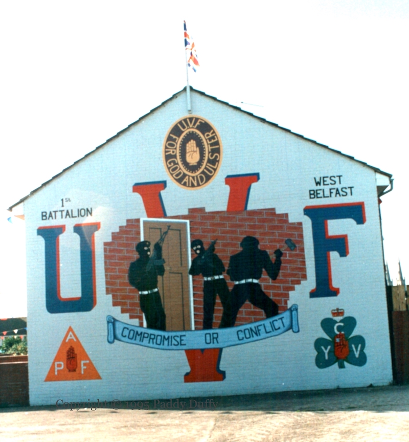 “Compromise” in “Compromise or conflict” hints at the potential of the peace process but loyalist muraling continues to present hooded gunmen (in this case from “1st battalion, west Belfast UVF”) engaged in physical-force activity. In the same vein, see Prepared For Peace, Ready For War.