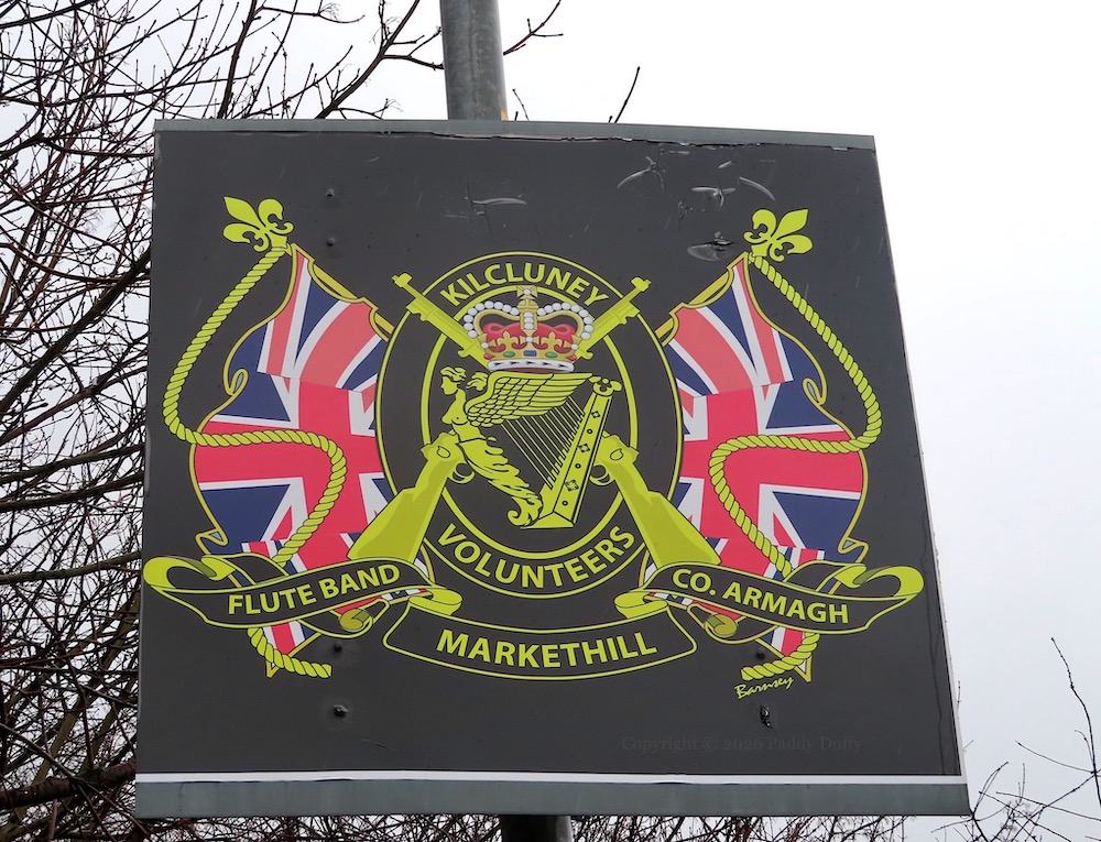 The badge or insignia of the 36th (Ulster) Division most frequently seen in murals is the one on the left of this board in Ballyduff, combining a red hand on a field of shamrocks with the Union Flag and the harp of the Royal Irish Rifles. The simpler insignia of the 36th Division on the right is being seen more frequently – it features a left-handed red hand, while the other uses a right-handed red hand, as do the flags of Ulster and of Northern Ireland.