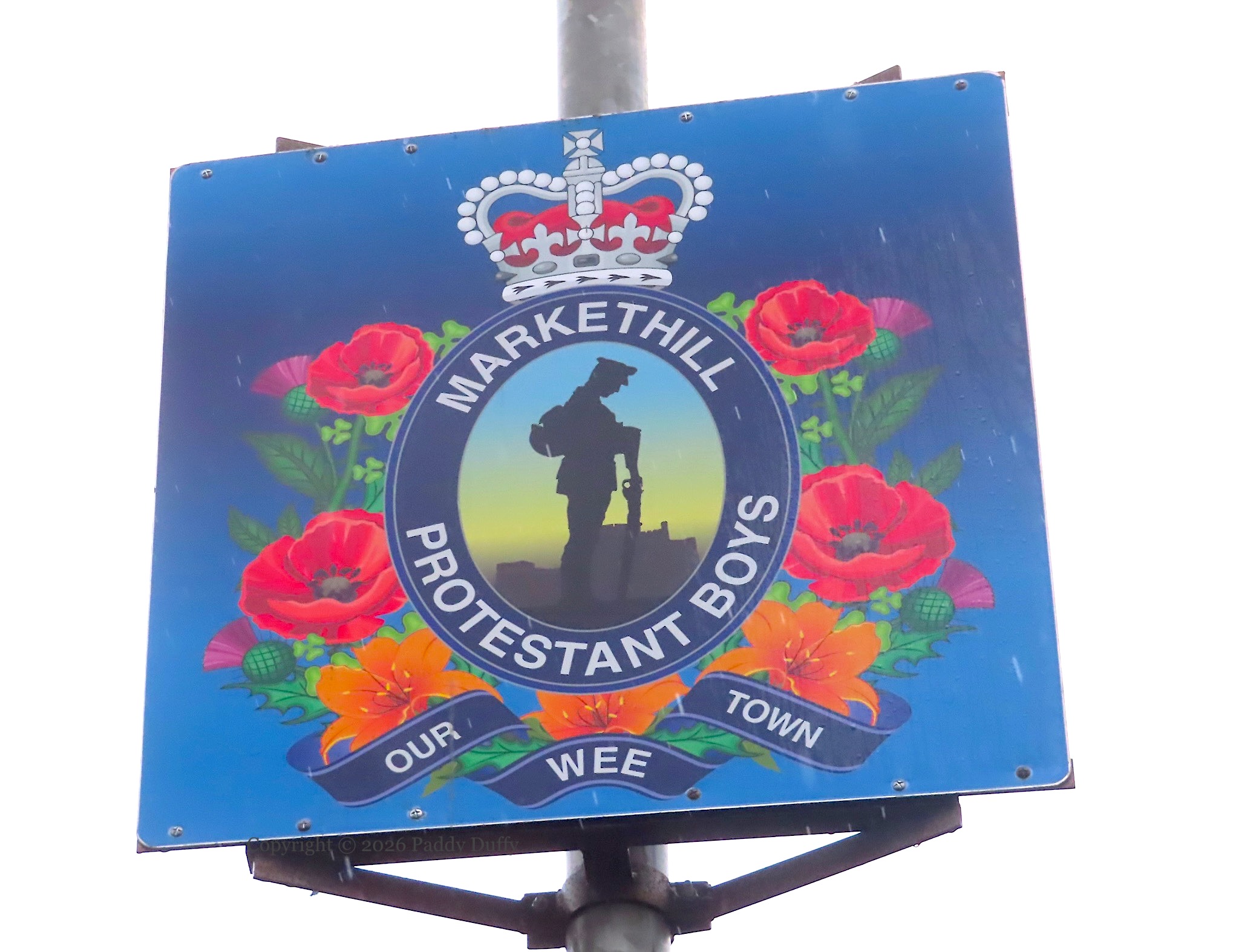 The badge or insignia of the 36th (Ulster) Division most frequently seen in murals is the one on the left of this board in Ballyduff, combining a red hand on a field of shamrocks with the Union Flag and the harp of the Royal Irish Rifles. The simpler insignia of the 36th Division on the right is being seen more frequently – it features a left-handed red hand, while the other uses a right-handed red hand, as do the flags of Ulster and of Northern Ireland.