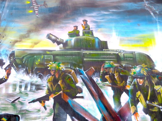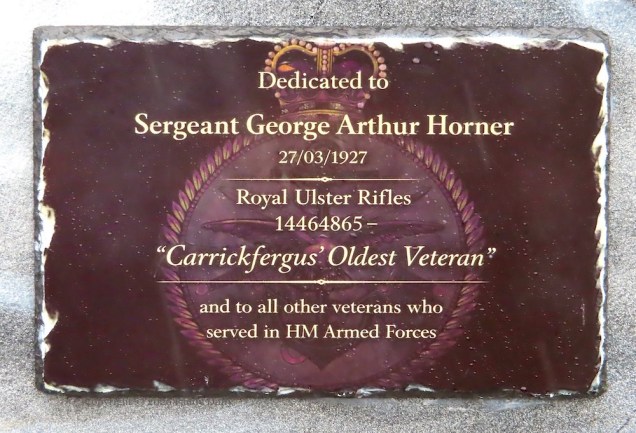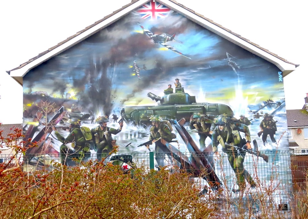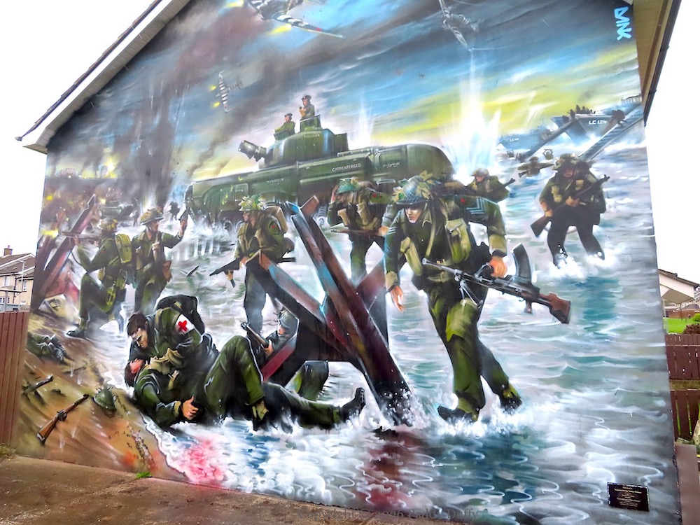 The plaque in the bottom-right corner reads, “Dedicated to Sergeant George Arthur Horner 27/03/1927 Royal Ulster Rifles 14464865 — “Carrickfergus’ Oldest Veteran” and to all other veterans who served in HM Armed Forces.” Horner turned 99 a few days after this mural of D-Day was unveiled (on March 22nd) and he was awarded the freedom of Mid- And East-Antrim Borough (web). He served in the second battalion of the Royal Ulster Rifles, and landed on Sword Beach during the D-Day landings in June 1944 (Fb).