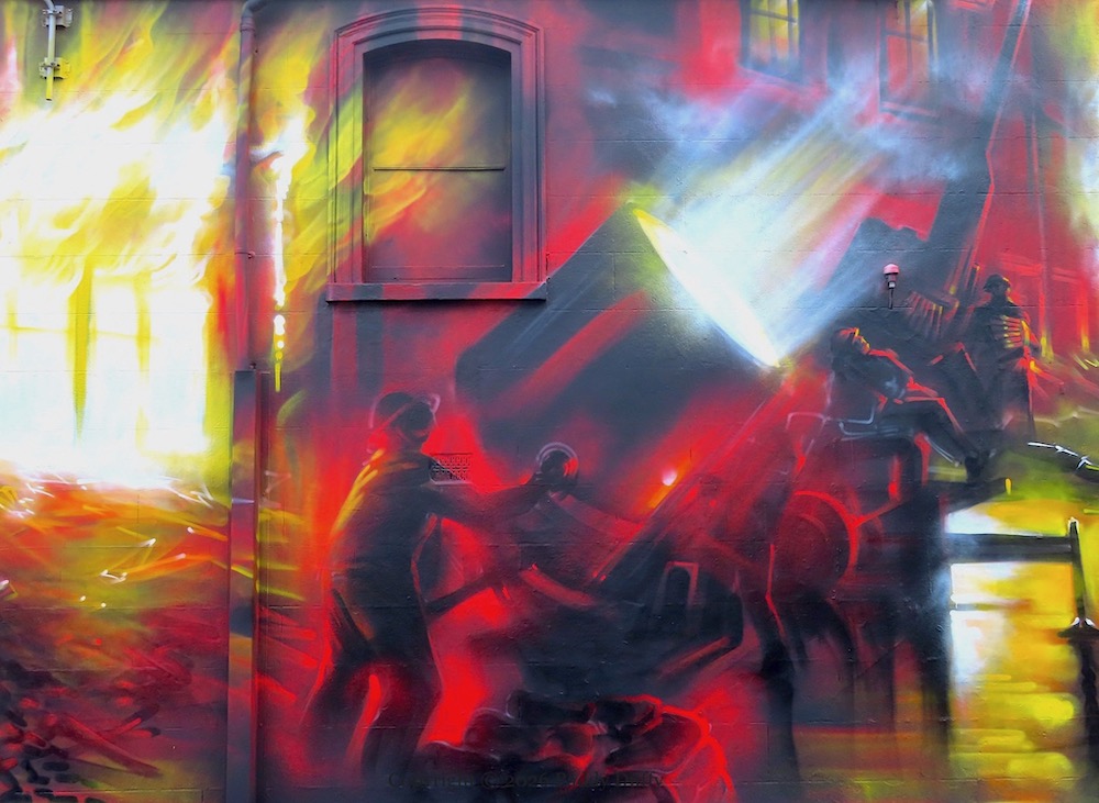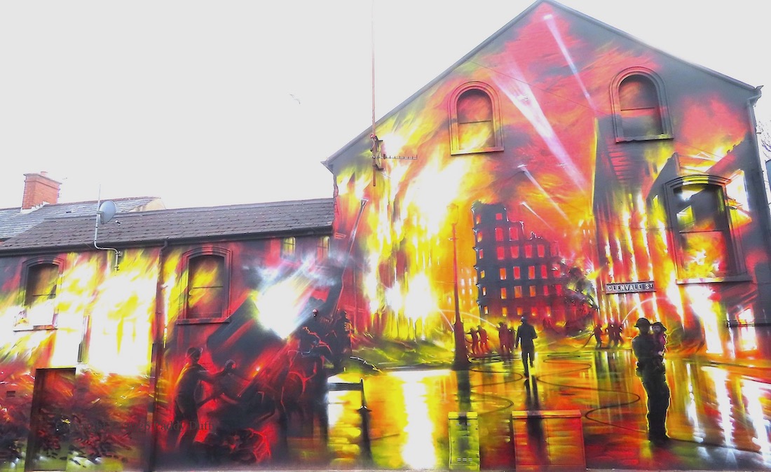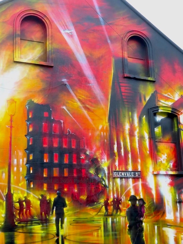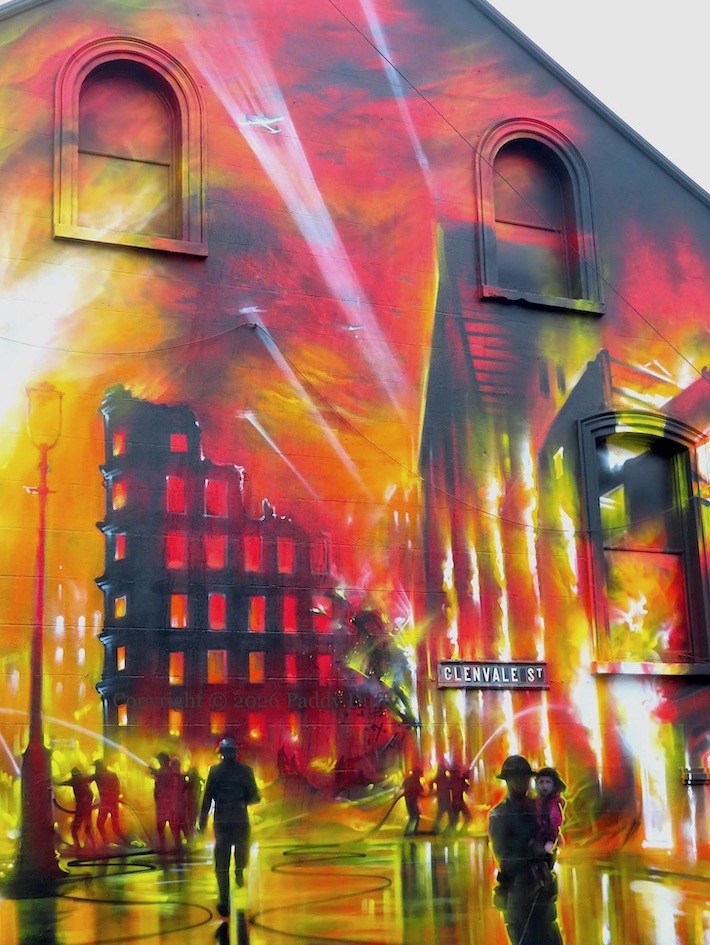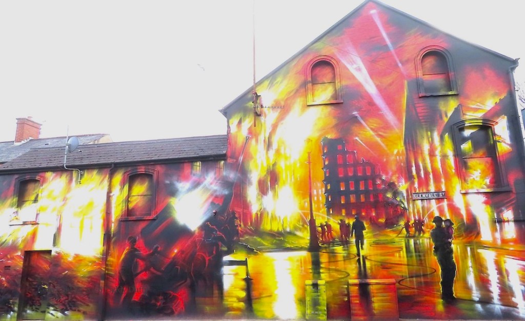 This is a representation of the 1941 Belfast Blitz, providing a graphic companion to the large board in Enfield Street, which contains information and images, and a list of 79 people from the Woodvale who died in the blitz. (There is also a plaque on the side of the Woodvale Community Centre.) There were three separate nights of bombing: April 7th/8th, April 15th/16th, and May 4th/5th and half of the buildings in Belfast were destroyed or damaged (WP); it is not clear what particular buildings are being depicted here.