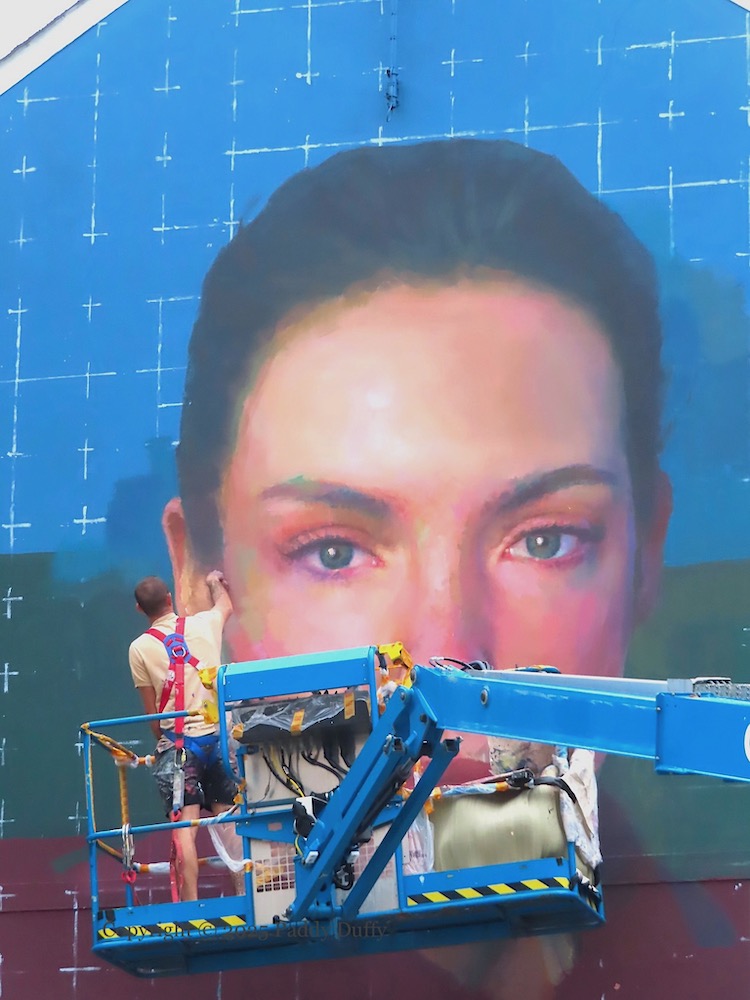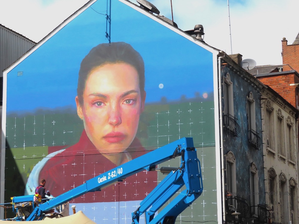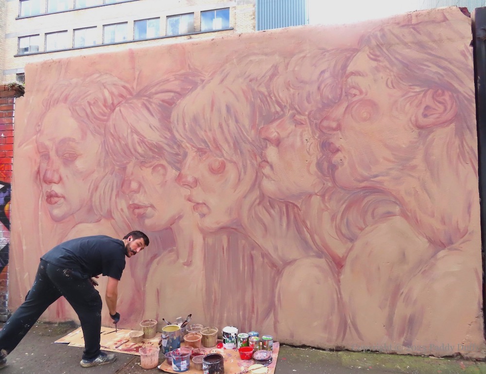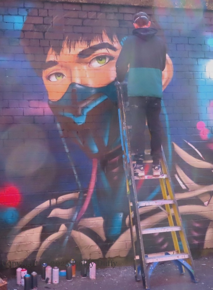 This street art is by Spanish artist Slim Safont (web) on a side wall of the Spaniard in Skipper Street, Belfast city centre, for Hit The North 2025 (Seedhead Arts).
