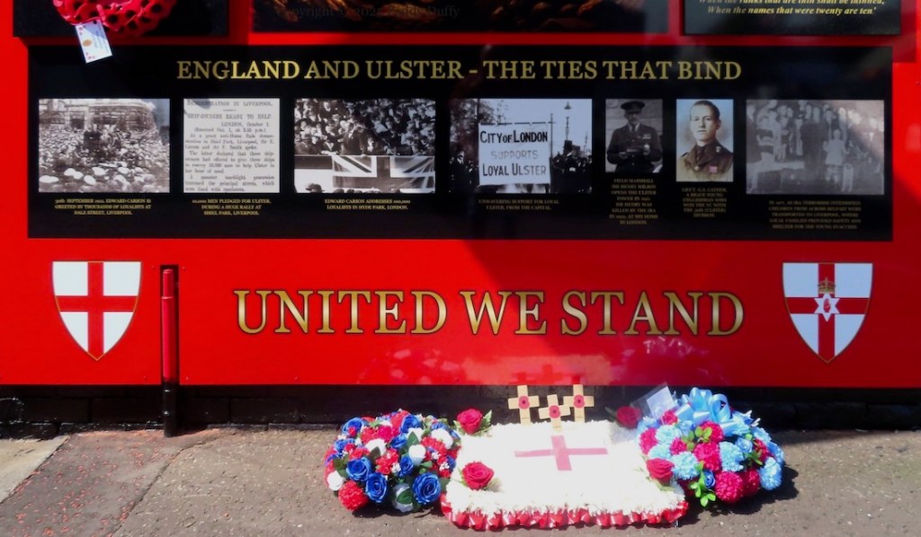 The images along the bottom illustrate the connection between Northern Ireland and England. From left to right: Edward Carson in Liverpool in 1912; 10,00 pledges from Liverpool men; Carson addressing 100,000 people in Hyde Park, London; a banner reading “City of London supports loyal Ulster”; “Field Marshall Sir Henry Wilson opens the Ulster Tower in 1921. Sir Henry was killed by the IRA in 1922 at his home in London”; GS Cather, VC winner with the Ulster Division; evacuees to Liverpool in 1973.