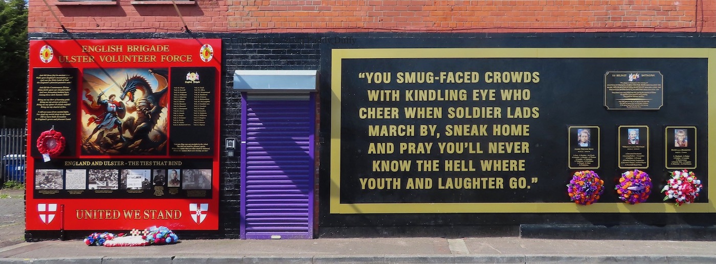 Spier’s Place, middle Shankill, west Belfast. For the memorial on the right (in the wide shot) see A Fisherman, An Entertainer, A Shankill Road Man.