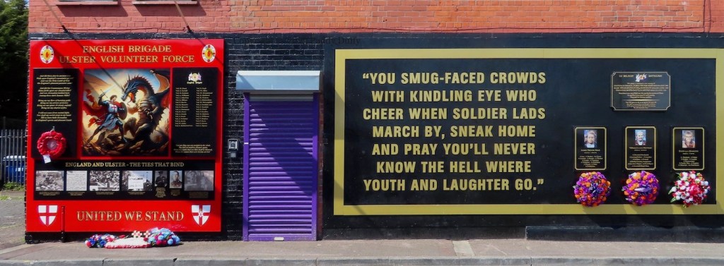 The text at the bottom of this Shankill Road poster reads: “‘My dear friends, this is your hour. This is not the victory or of any class, it’s a victory of the Great British people as a whole. We were the first, in these ancient isles, to draw the sword against tyranny.’ – Prime Minister Winston S Churchill”. The lines come from brief remarks Churchill made to the crowds assembled at the Ministry Of Health in London – the text can be found at Forces News; Pathé newsreel of Churchill’s earlier radio announcement of the end of the war can be found on youtube.