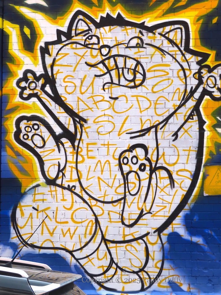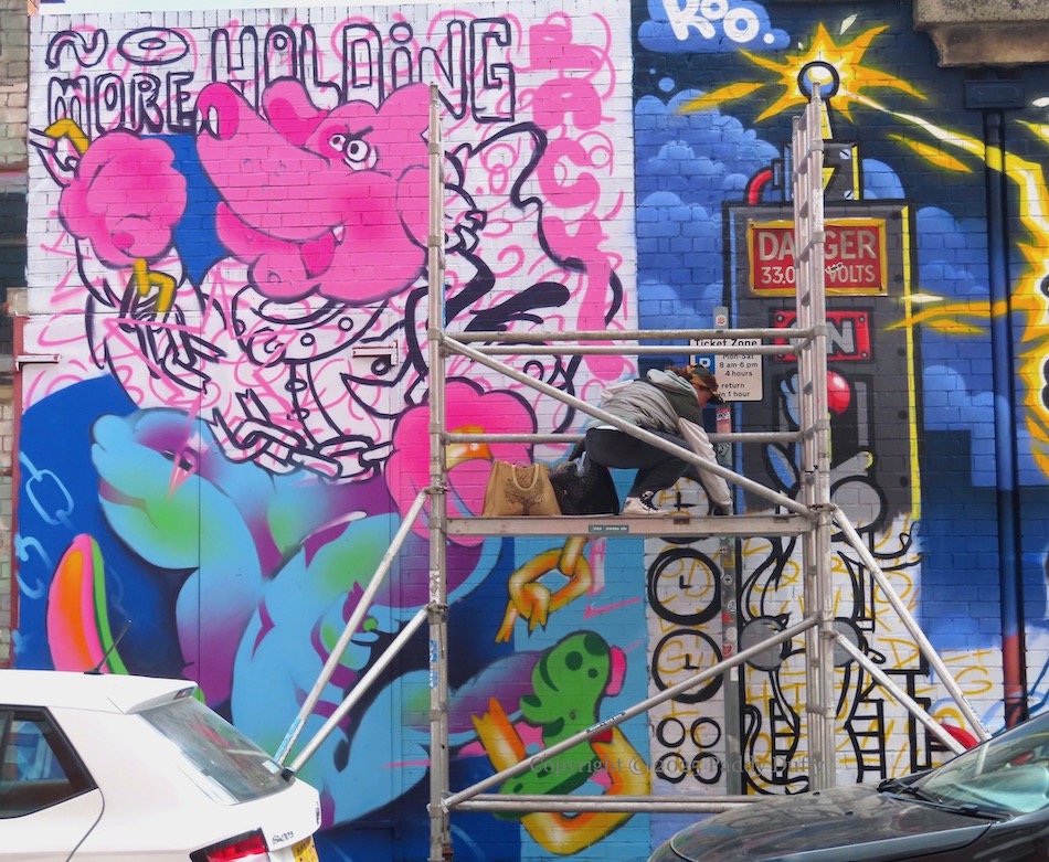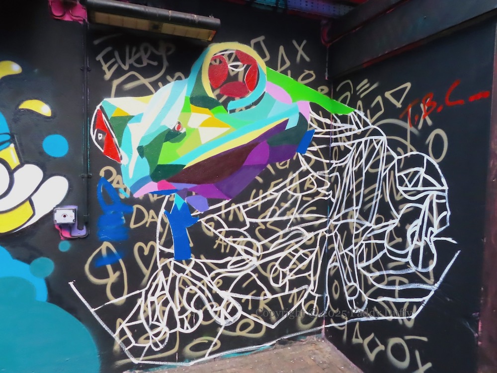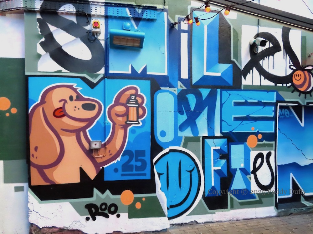 Work by English artist My Dog Sighs (web) in Talbot Street for Hit The North 2025 (Seedhead Arts), with a Belfast-specific reflection, including the Albert Clock and the gantry cranes Samson & Goliath; the child with an ice-cream is three-year-old Teddy, son of street artist Codo (ig).
