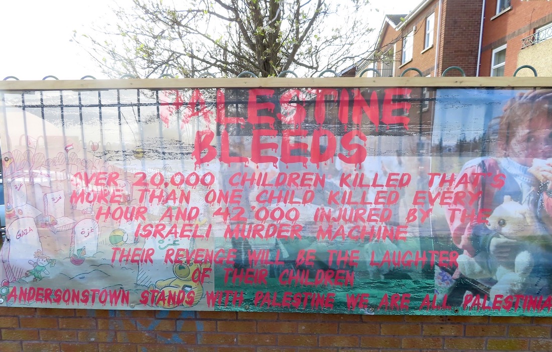 “Palestine bleeds. Over 20,000 children killed. That’s more than one child killed every hour. And 42,000 injured by the Israeli murder machine. Their revenge will be the laughter of their children. Andersonstown stands with Palestine. We are all Palestinians.” The figures perhaps come from a Save The Children report from September, 2025.
