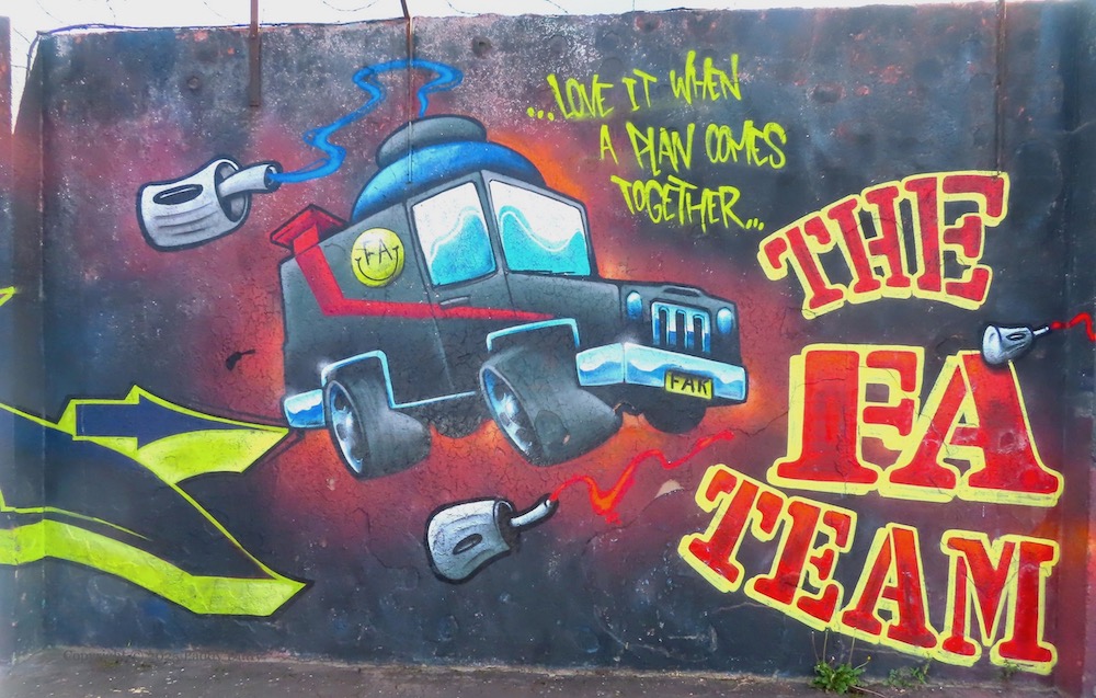 “I love it when a plan comes together” was the catch-phrase of Hannibal Smith, leader of the (fictional) A-Team, a crew of US soldiers from the Viet Nam war, on the run from the military police and working as hired guns back in the States, in the US television show of the same name. The font used in “THE FA TEAM” (below), like the font used in the show’s title card and credits, imitates military stencils.