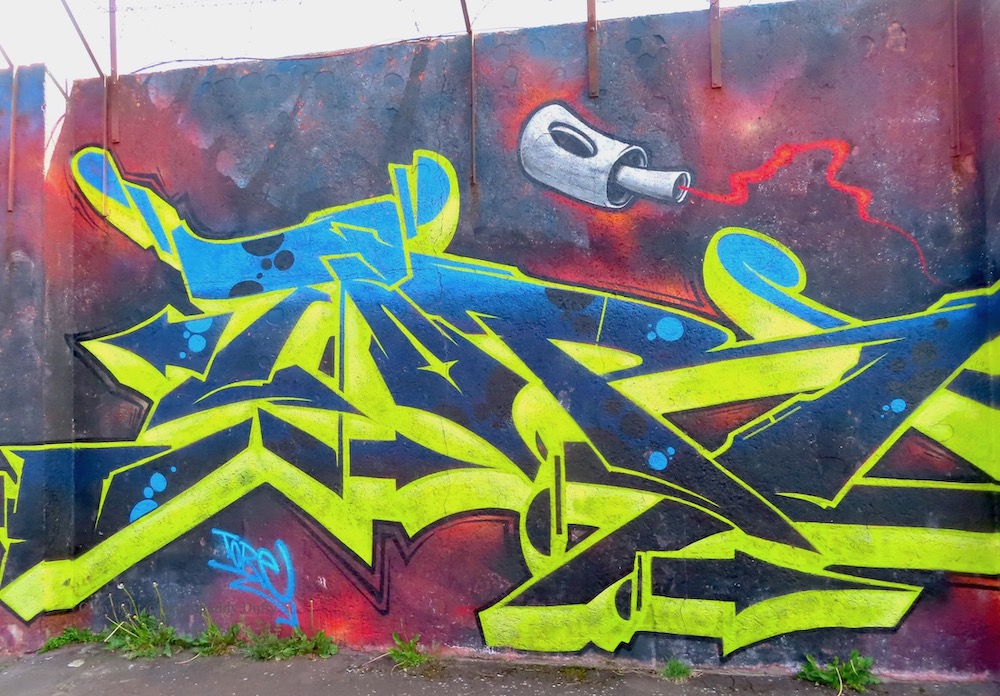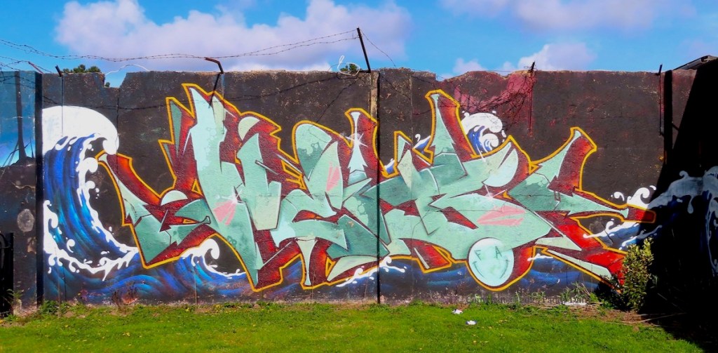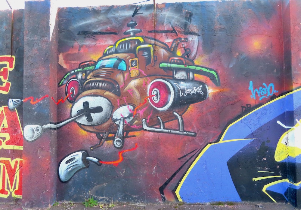 There were 98 episodes of the action-series (WP), and it felt as though at least 97 of them involved the gang’s GMC Vandura van being turned into an armed vehicle and used in a spectacular, guns-blazing, escape from and/or assault on the bad guys, assisted by daredevil helicopter-flying by Howling Mad Murdock. Both vehicles have been modified in the Foreign Assassins (Fb) graffiti art shown here with spray cans that are firing their caps as missiles.