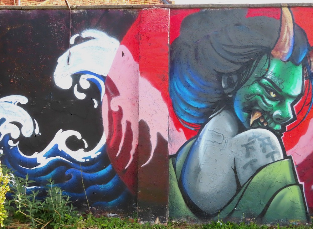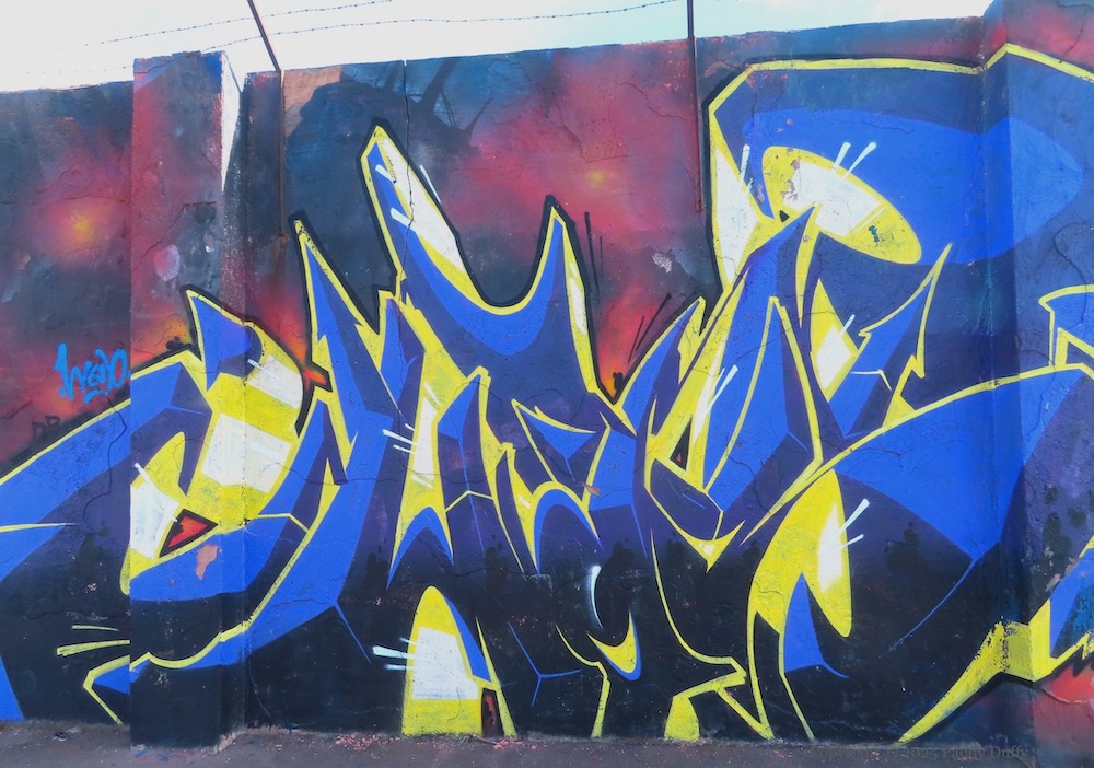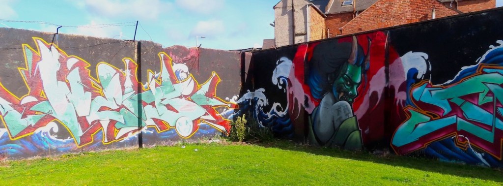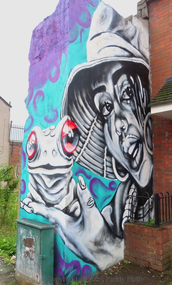 The Bank Of Ireland building at the junction of North Street and Royal Avenue was purchased by the City Council in 2021 (Business Insider) with the intention of turning it into a visitor attraction called ‘Belfast Stories’ by 2030. The latest step in the process was a period of public consultation (BelTel). In the meantime, Leo Boyd (web) has taken over the boarded-up space that previously housed the ATM with an image of space invaders hovering over the building.