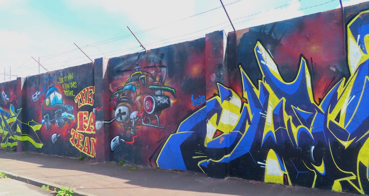 For the RNU piece on the left (in the wide shot) see The Rising Of The Moon. Like the piece on the right, it features Kieran Doherty and Joe McDonnell, two of hunger strikers who were local to the area. For background information, see the board formerly on the wall: To Whom Do We Owe Our Allegiance Today?