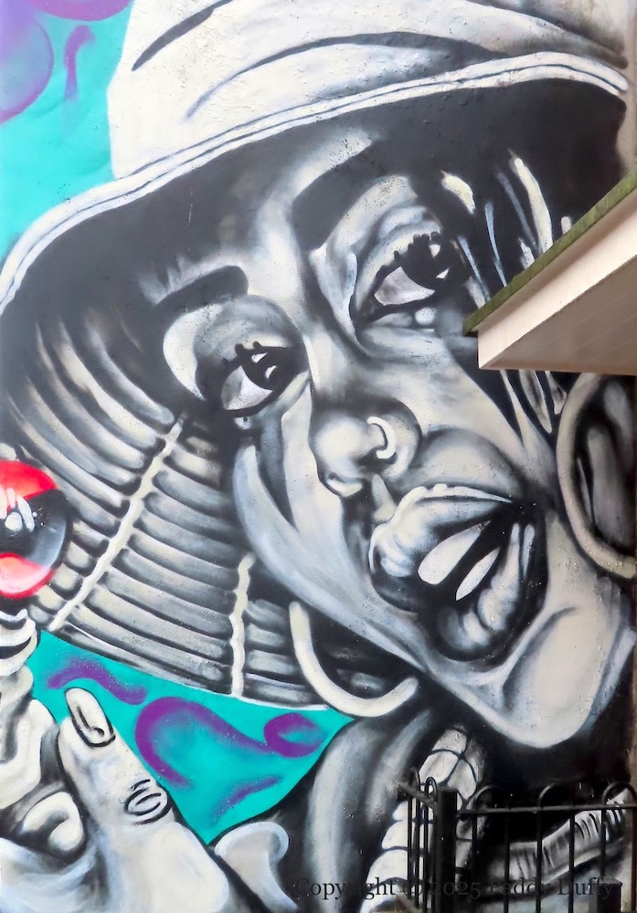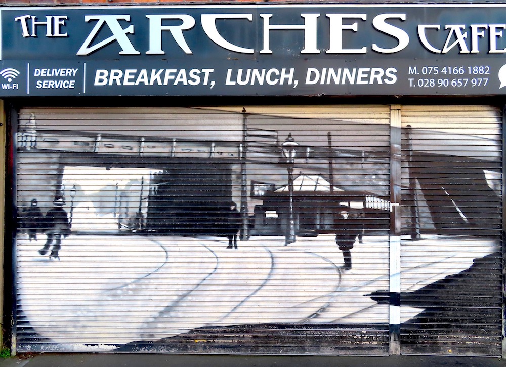 This mural is on the shutters of the nearby Arches Café (web); the vintage photograph reproduced can be seen in this pdf from Eastside Partnership.