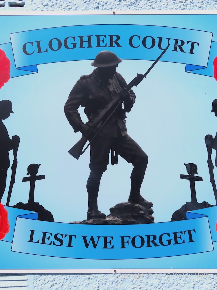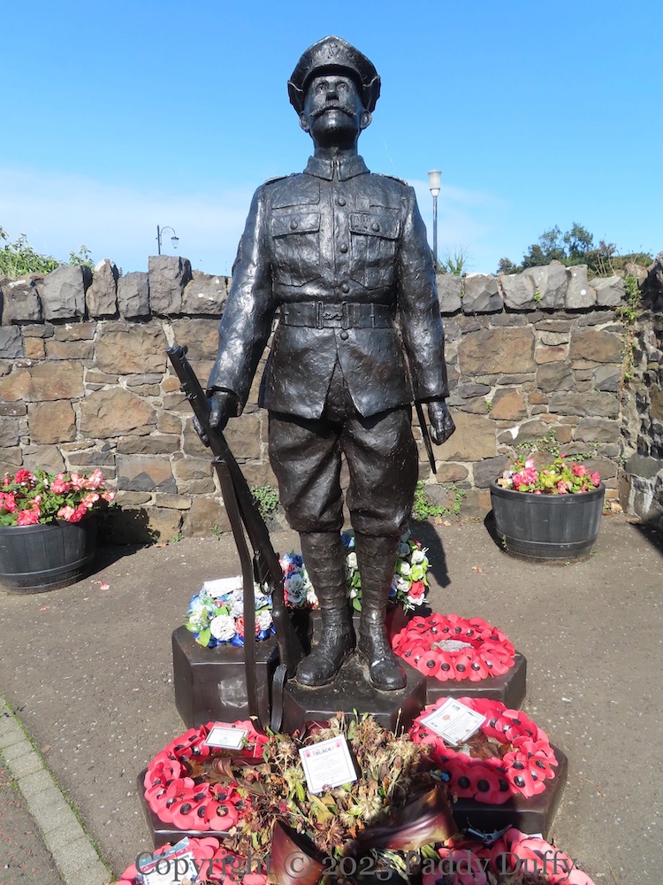 153 men of the 12th Battalion Royal Irish Rifles (which included men from Ballymena and other Central Antrim Volunteers) died on the first day of the Battle Of The Somme, July 1st, 1916. The 12th’s Robert Quigg received the VC for his actions in the evening, rescuing wounded men from no-man’s-land. He is remembered by the statue and plaque (shown below) in Bushmills; he was from Ardihannon townland near the Giant’s Causeway and before the war commanded the Bushmills unit of the Ulster Volunteers (WP).