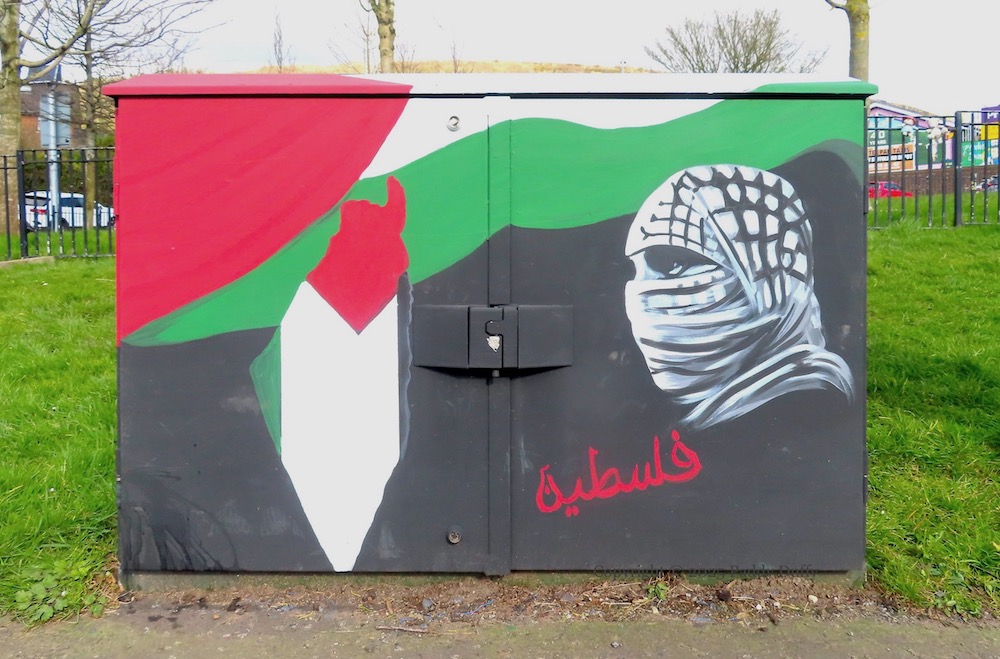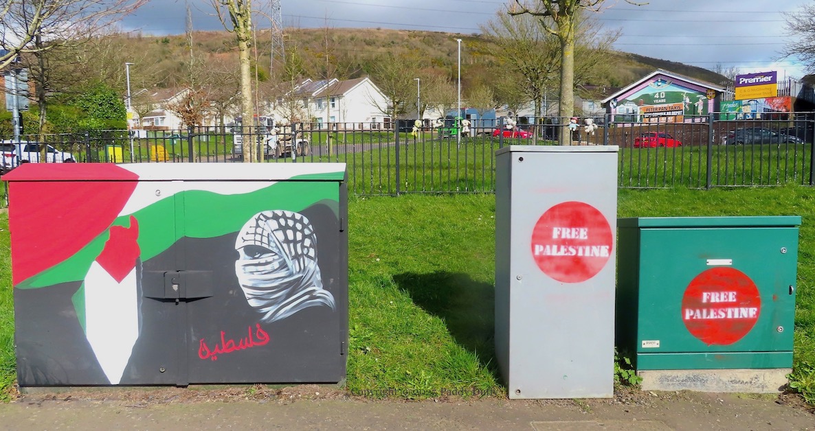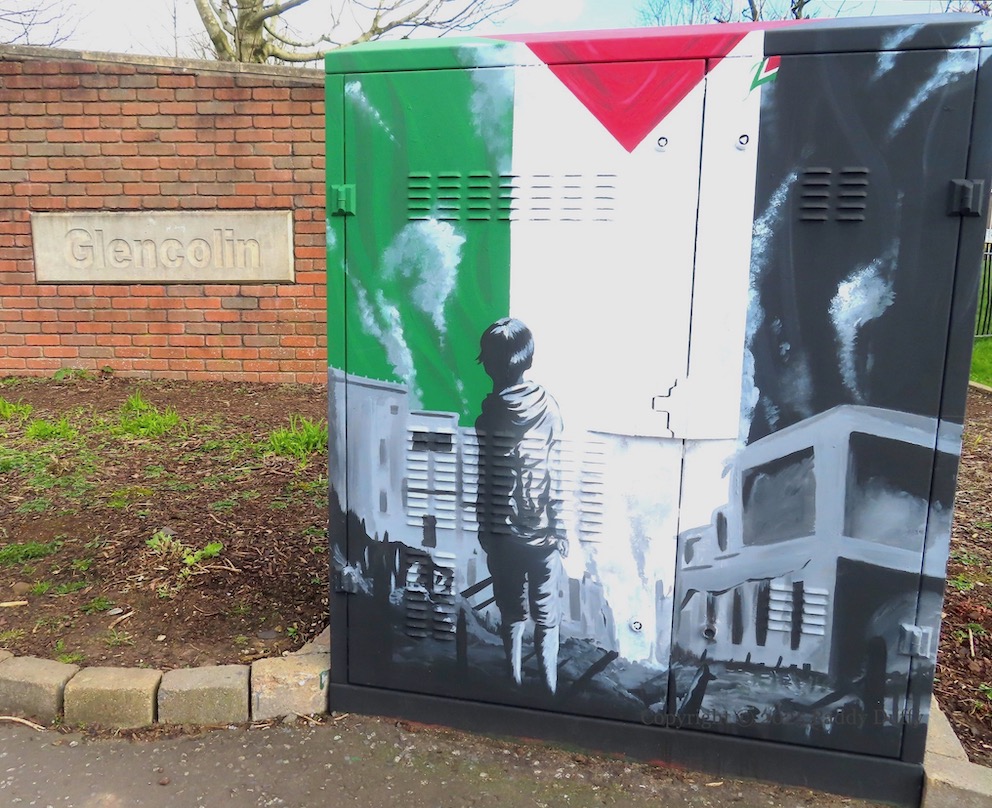 This new mural, which features a Celtic Cross (emblem of the Association) and Cú Chulaınn (symbol of republican dead), is part (along with Free Palestine) of the side-wall next to Éırí Amach Na Casca. Easter Monday, this year, is April 21st.