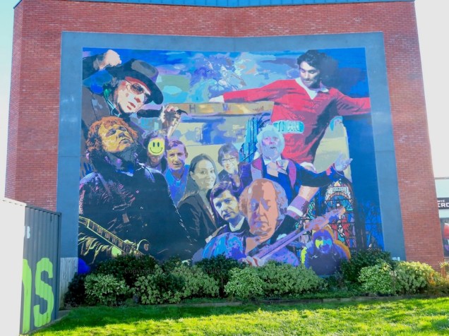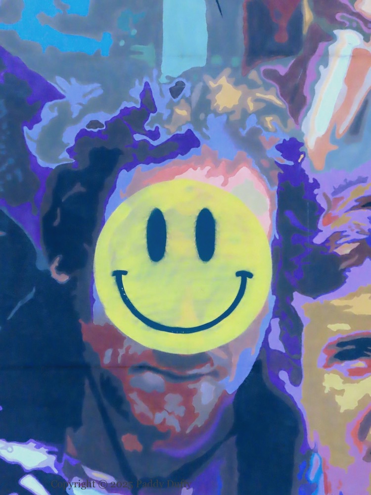 This entry updates (with close-ups) the image seen in 2022’s Luminaries And Legends Of Eastside which showed (from afar) the ‘famous faces’ mural at Connswater/CS Lewis Square in east Belfast with a large “smiley” face over DJ David Holmes – a (presumably) unauthorised addition to the 2017 original. Word is that Holmes’s image was painted over because he is not from east Belfast. It’s not clear (from on-line sources) where exactly in Belfast Holmes is from; he lived in Los Angeles, California, for a time before returning c. 2014 (Irish Times).