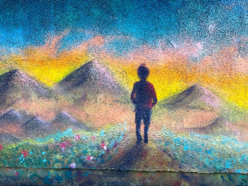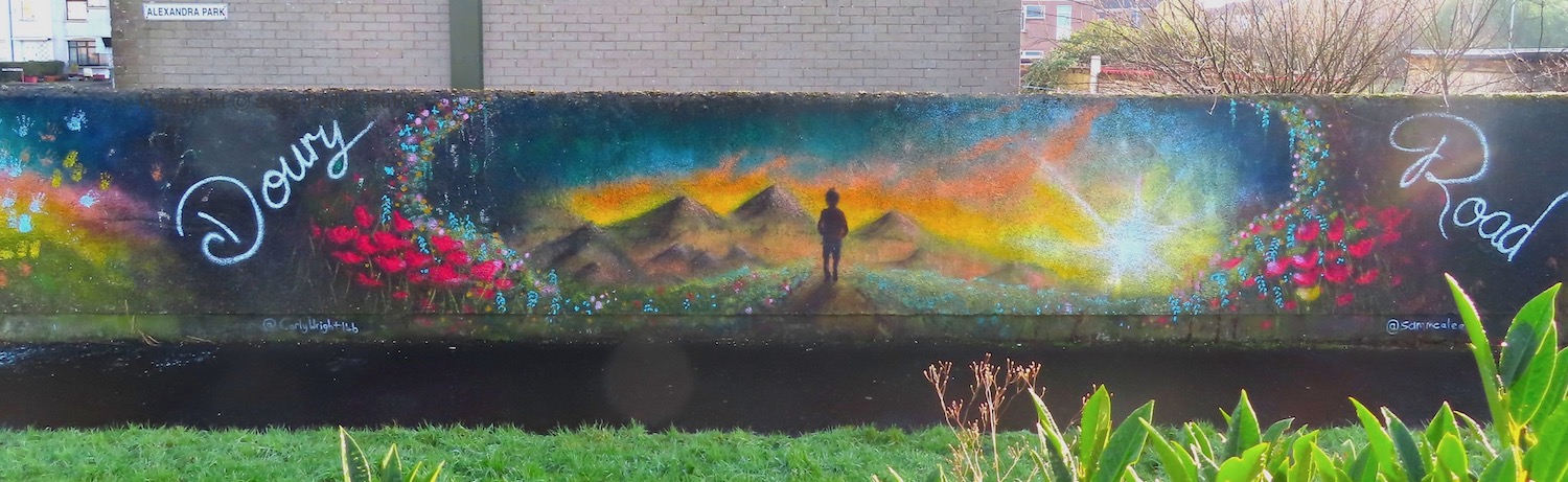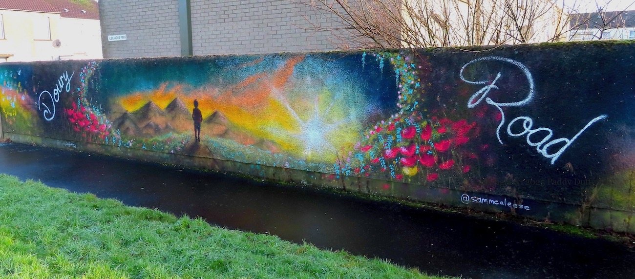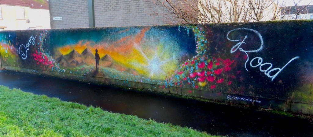 The official title of this piece is ‘The Estate With Love In It’ (Love Ballymena) but the figure at the centre of it appears to be heading toward some faraway land. Nonetheless, efforts are being made by the proud residents (Fb group) to improve the estate, compared to conditions a decade ago – see the short film from 2013 at Poverty & Social Exclusion.