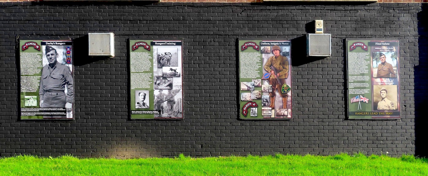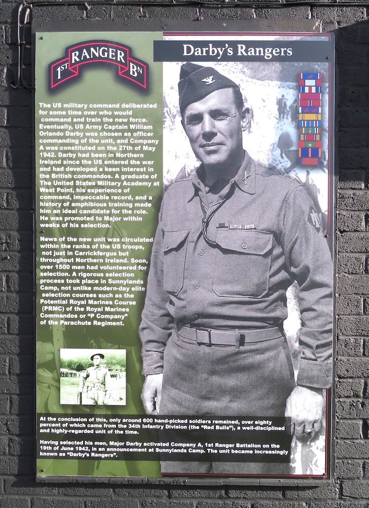 This entry updates Four Lads Had A Dream, which showed seven boards on the low wall opposite the Monkstown social club. Three more boards have been added to the right-hand end of the wall. One (above) has a gallery of photographs from the history of the Monkstown YCV flute band (Fb) “established 1974”, the second gives the lyrics to a song by Jim English, which was written for the band’s “50th anniversary battlefield tour” (Fb), photos from which are shown in the third panel.