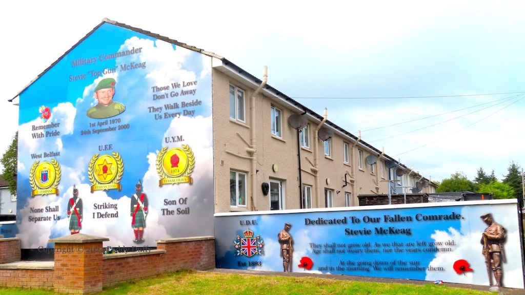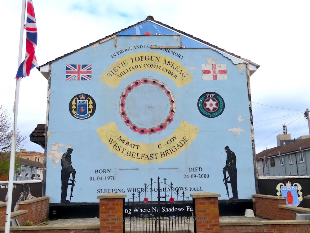 Stevie McKeag, hit-man for the UDA’s second battalion (west Belfast) ‘C company’, killed at least a dozen Catholics between 1990 and 1998 (WP). The version presented on the left-hand side-wall (just below) begins, “It is not given to people to judge what’s right or wrong. People have internally been mistaken and will be mistaken …” which seems to be contradictory, and then continues “… and in nothing more than in what they consider right and wrong” which is difficult to parse so as to give the intended meaning.