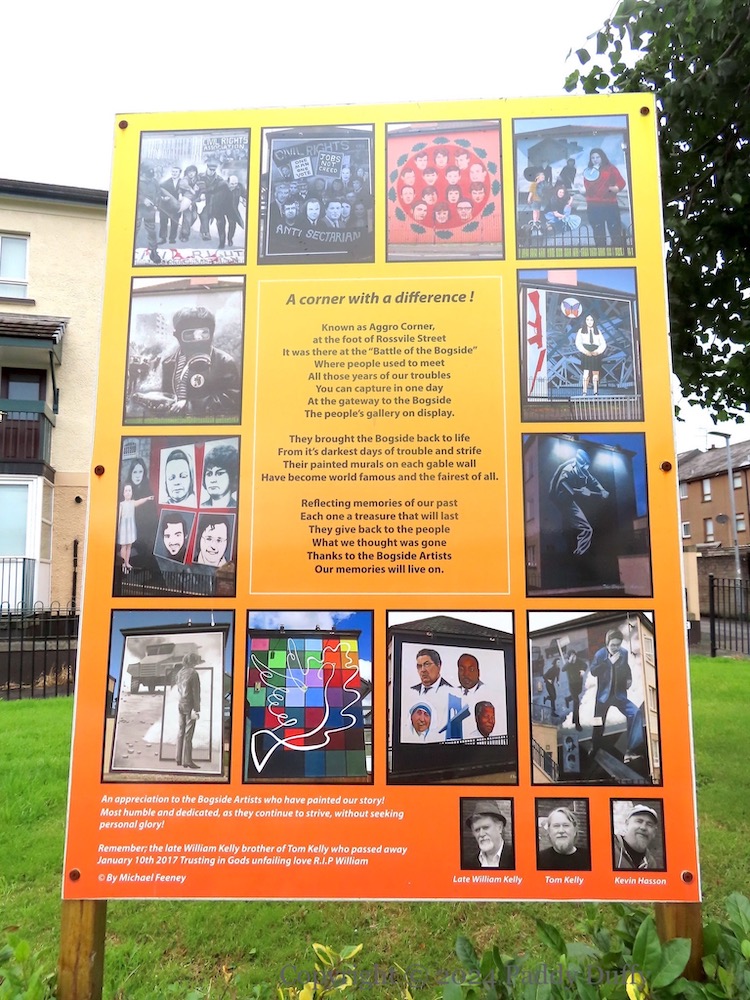 “Known as Aggro Corner,/at the foot of Rossville Street/It was there at the “Battle of the Bogside”/Where people used to meet//All those years of our troubles/You can capture in a day/At the gateway to the Bogside/The people’s gallery on display.//They brought the Bogside back to life/From its darkest days of trouble and strife/Their painted murals on each gable wall/Have become world famous and the fairest of all.//Reflecting memories of our past/Each one a treasure that will last/They give back to the people/What we thought was gone/Thanks to the Bogside Artists/Our memories will live on.”