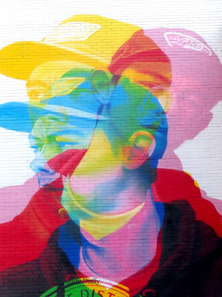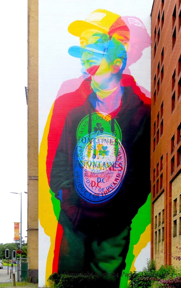 “For Mickey Griffiths, the punk of this parish.” In the 1970s and ’80s, Mickey Griffiths from the Brandywell, Derry, served as drummer and lyricist for a series of Derry punk bands: Idol Threats, Dick Tracy & The Green Disaster, The Shameless Hussies, and The Hitlers (NIPunk). Griffiths died in November of 2018 (Derry Now) and this mural was painted in Castle Street/Magazine Street by UV Arts (ig) to remember both him and the 45th anniversary of the Undertones’s hit ‘Teenage Dreams’ (Fb).