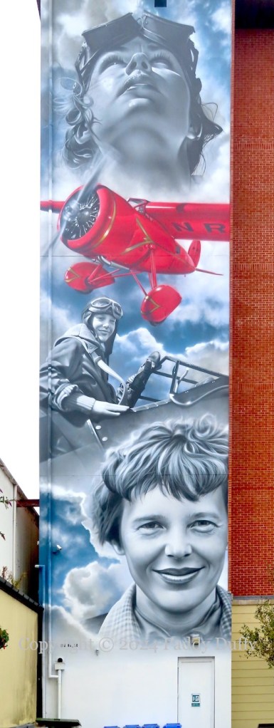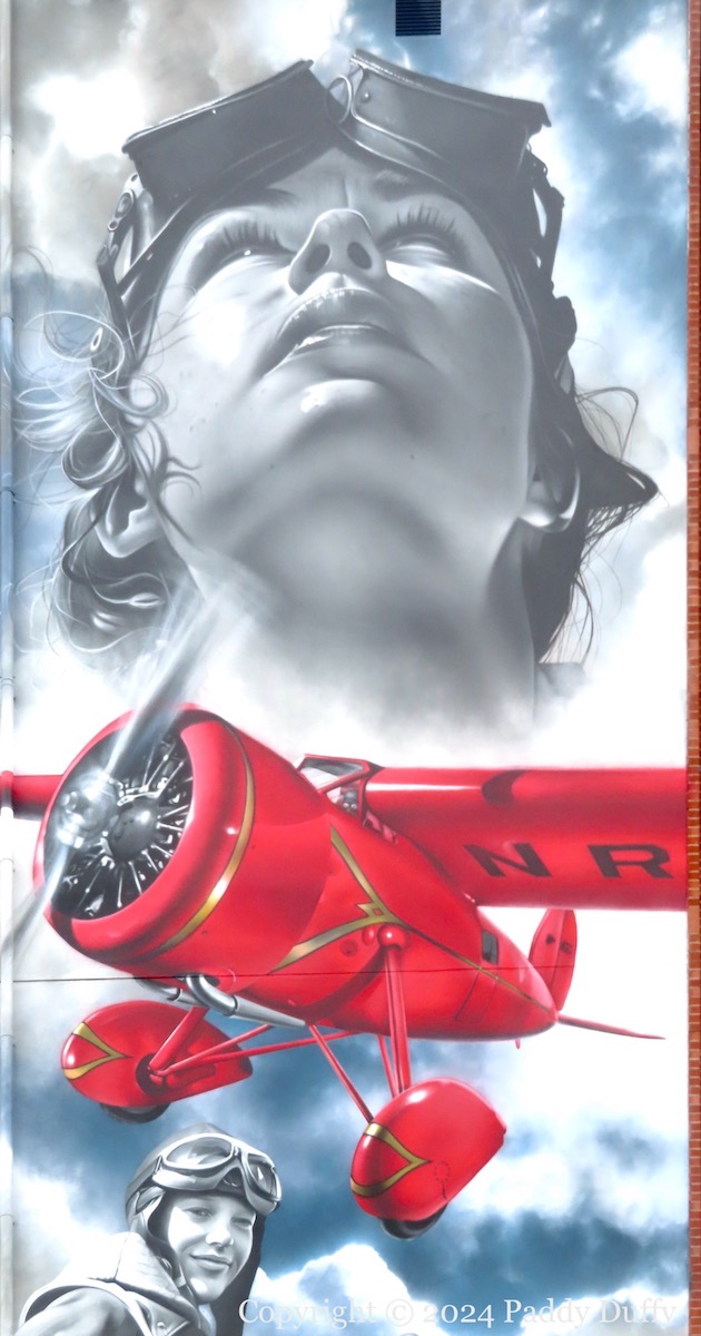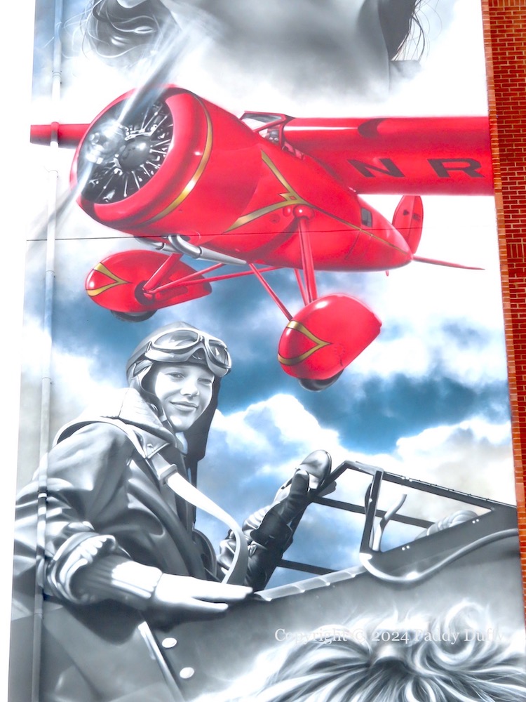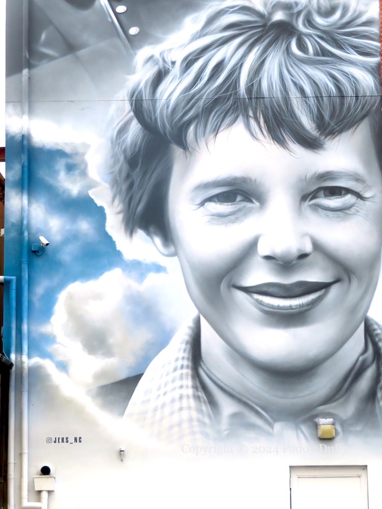 A new painting of Amelia Earhart has been created by JEKS (ig), on the side of the Foyle building, North West Regional College, on Queen’s Quay. A number of sources claim without citation or measurement that it is the tallest piece of street art in the north – both the BBC and the Chamber Of Commerce use the passive “thought to be”. Its closest competitor would be the recent piece by Zabou on the Telegraph Building in Belfast – see Broken Promises.