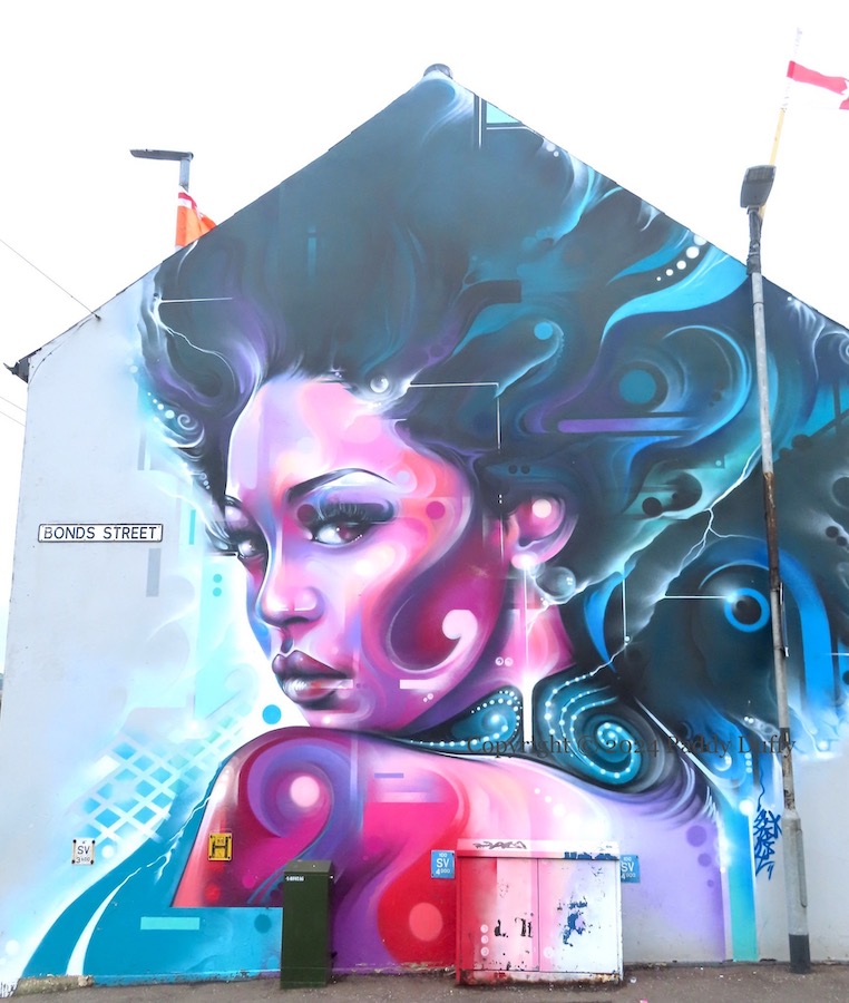 Here is a painting of a model from Femelle Studios (ig) by London artist Mr Cenz (web | tw) in Londonderry’s Waterside, with support from UVArts (ig). With “Death dealers out” graffiti to the right.