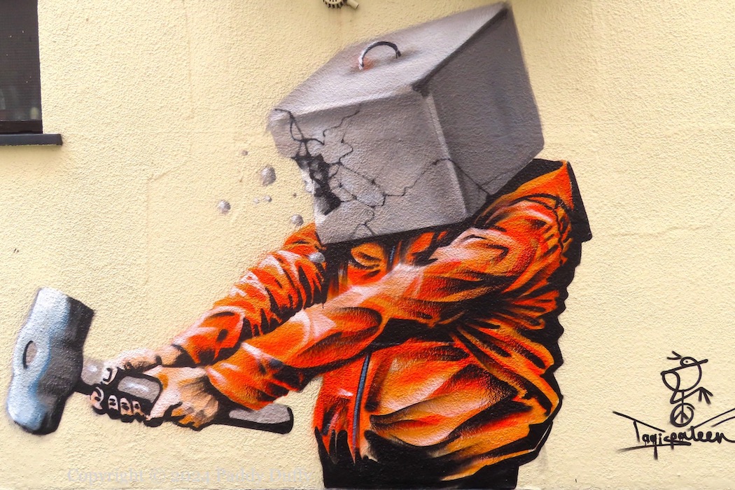 The Starry Plough currently serves as a symbol of the IRSP (web). The painting shown above is on an electrical box in St James’s Park (near the new Connolly centre); the other painting, below, which might still be in progress, is outside the IRSP’s Costello House on the Falls Road