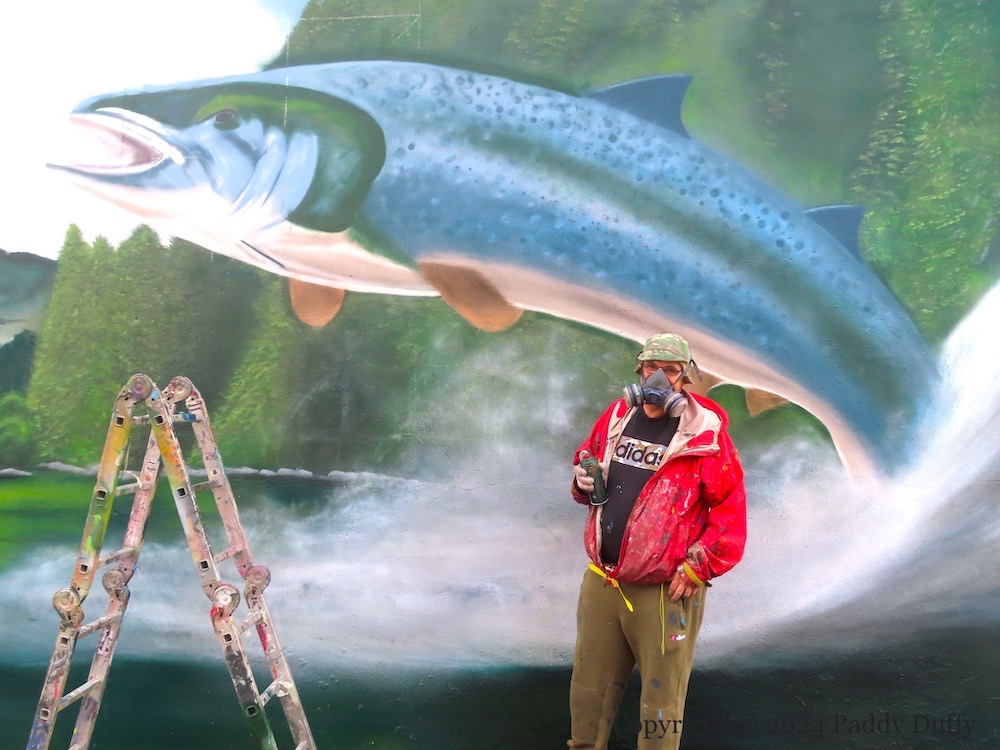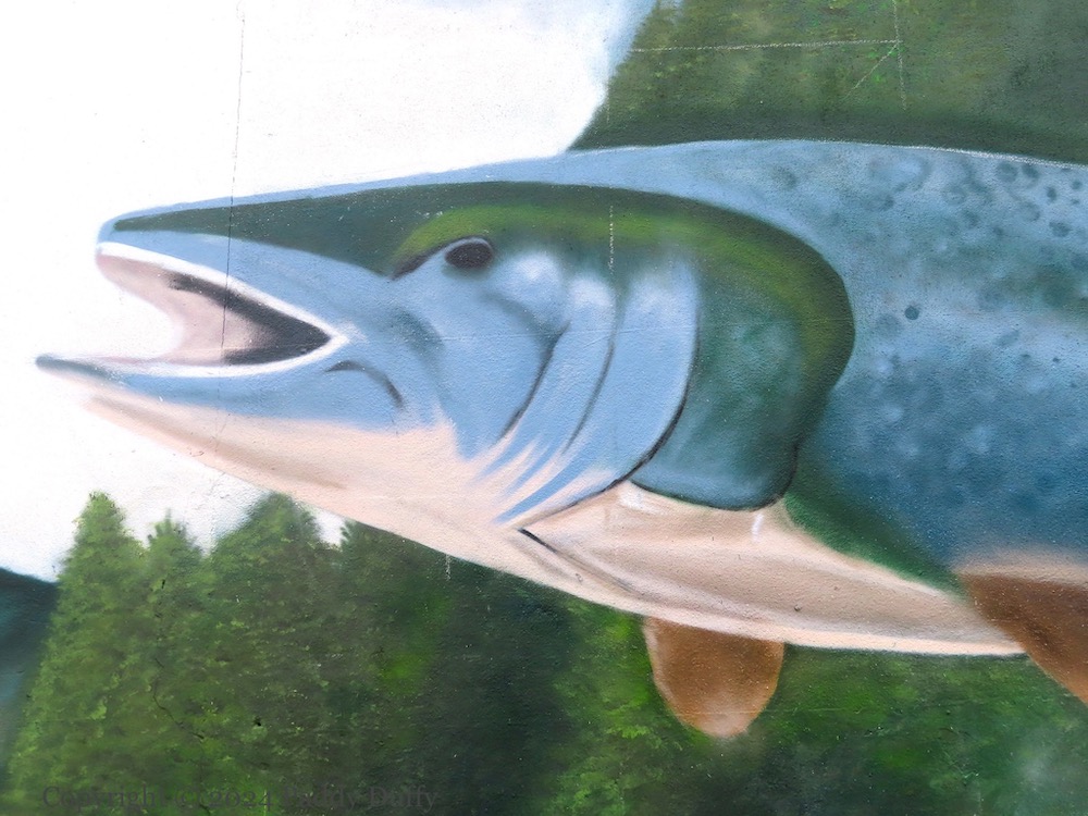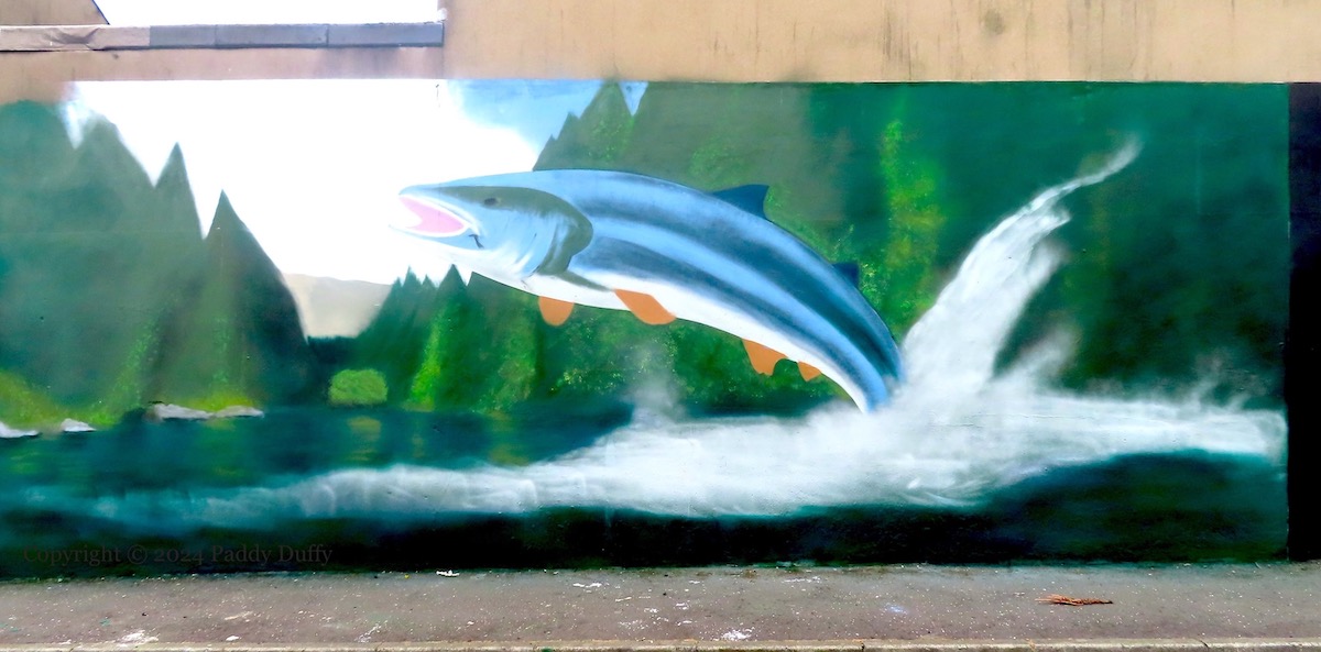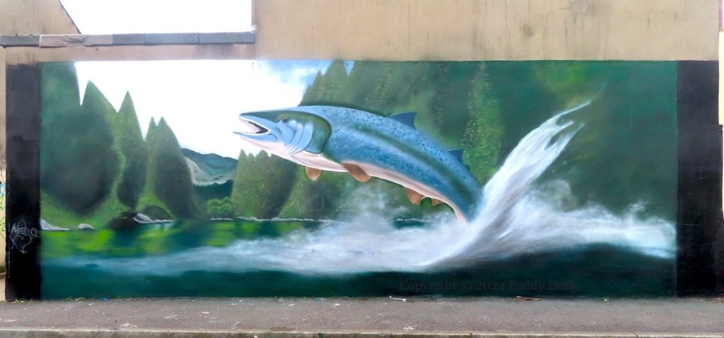 Salmon disappeared from the Lagan in the late 1700s. The river was restocked in 1991 (CFB) and some salmon have been seen and caught since then (Flickr | Fly Forums). (The angling season is March to October – NIDirect | DAERA.) A more reliable salmon sighting is the Big Fish, which has been in place since 1999 (Atlas Obscura), to which we can now add this Glen Molloy (ig) painting in Palestine Street, in the Holylands, south Belfast.