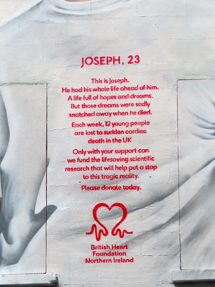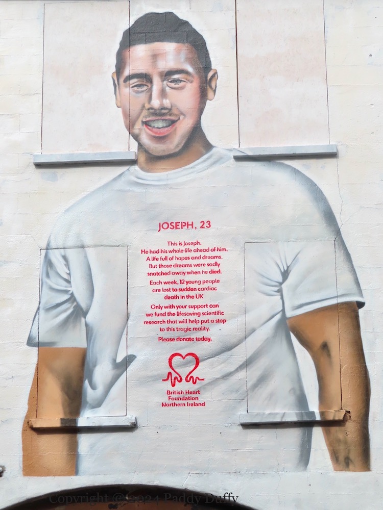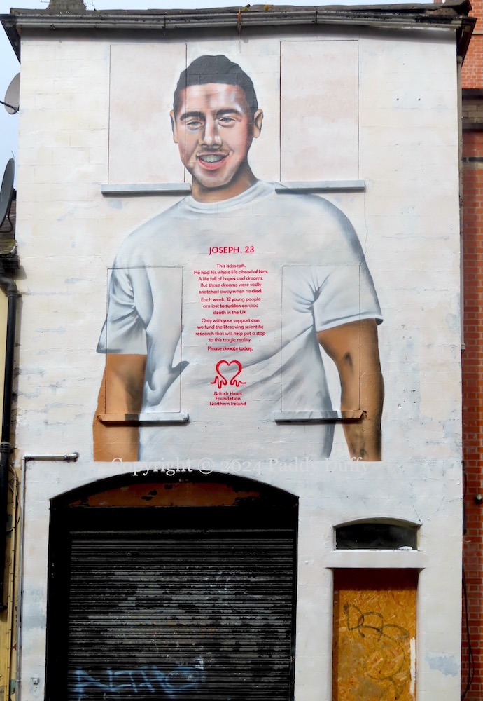 “Joseph, 23” is Joseph Burns, from north Belfast, who died in 2014 of a cardiac arrest. This is one of a dozen British Heart Foundation murals across the UK featuring victims below the age of 35 (Belfast Media | BelTel | Belfast Live). The other murals in the series – in Birmingham (Wolverhampton), Cardiff (Abertysswg), Chesterfield, Edinburgh, Glasgow, London (Essex, West Drayton), Newcastle, Nottingham, Southampton (x2) – are tied to the person’s support for a national soccer team (BBC | BHF).