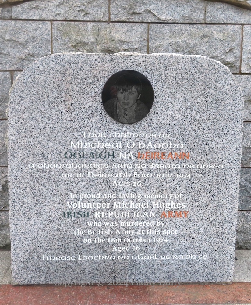 “I ndıl chuımhne ar Mhıcheál Ó hAodha, Óglaıgh na hÉıreann, a dhúnmharaıgh Arm na Breataıne anseo ar 18 Deıreadh Fómhaır 1974, aoıs 16. In proud and loving memory of Volunteer Michael Hughes, Irish Republican Army, who was murdered by the British Army at this spot on the 18th October 1974 aged 16. I measc laochra na nGael go raıbh sé.”