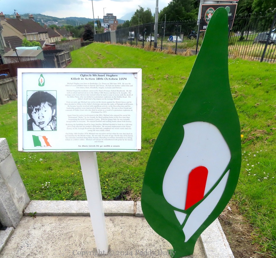 From the printed info board: “Michael Hughes was born in Banbridge, Co. Down on 28th June 1958. He was the oldest of seven children born to Patrick and Teresa. He had one brother called John and five sisters, Kate, Elizabeth, Angela, Lorraine and Patricia. Michael began his academic career at St. Peter’s Primary School Bessbrook. He did well at school and moved on to the Abbey CBS Newry and then to St. Joseph’s. His teenage years were thrown into turmoil when he had to come to terms with the death of his father Patsy, who was killed in a premature explosion on the Dublin Road. His father’s death had a big impact on the teenage Michael. From an early age Michael was active on the streets against the British forces and he then decided to follow in his father’s footsteps and join the ranks of Óglaıgh Na hÉıreann. He became heavily involved with republican activity in the Derrybeg area and his leadership qualities soon impressed all those around him. He was a close friend and comrade of Eddie Grant who also died in action as a result of a premature explosion on Christmas Eve 1973. Apart from his active involvement in the IRA, Michael also enjoyed his social life. Nicknamed “Sticky” by his friends, he liked nothing better in his free time than frequenting the local Community Centre. With his ginger hair, he was instantly recognisable to everyone. He enjoyed football and reading books about Irish history. Realising the hardships faced by large families, Michael decided to look for a full time job to help alleviate his mother’s difficulties. He secured employment at the Nylon factory on the Armagh Road but alas had only completed two weeks work when his young life was cruelly ended. On Friday 18th October 1974, Michael was on active service when he was shot dead on an Ulsterbus by the British Army. He was only 16 years of age. On the day of his burial, his comrades marched along Main Avenue, Derrybeg in military formation in a fitting tribute to a fellow soldier. Michael will always be remembered with pride by his family and friends. Ar dheıs láımh Dé go raıbh a anam.”