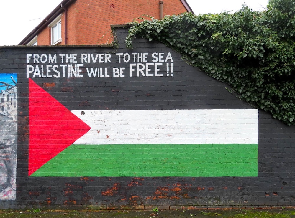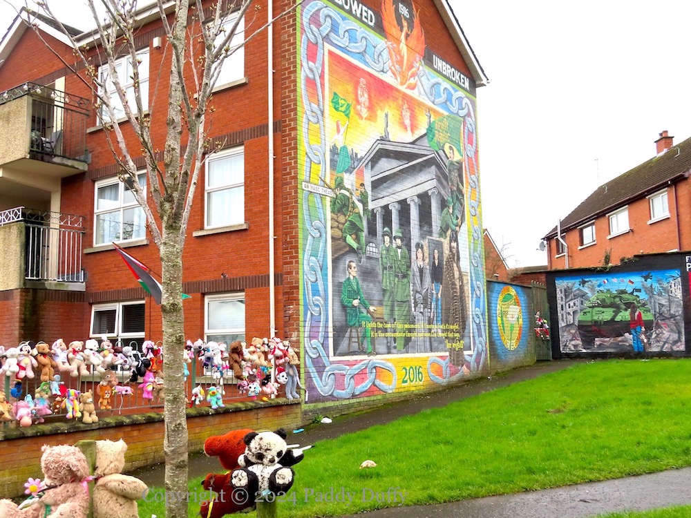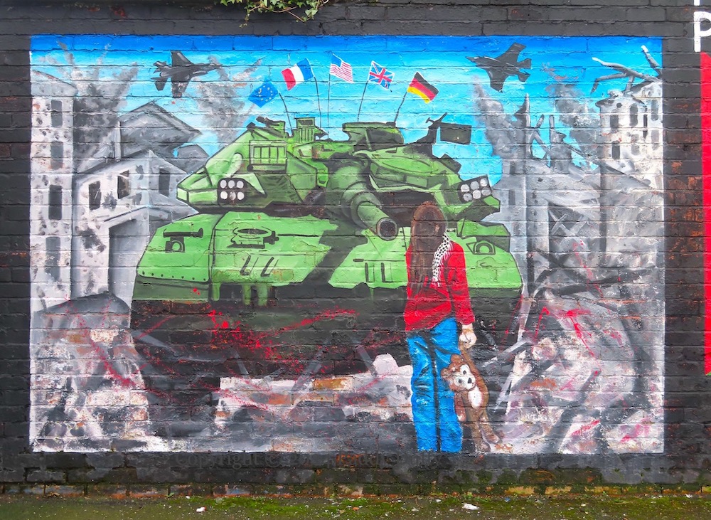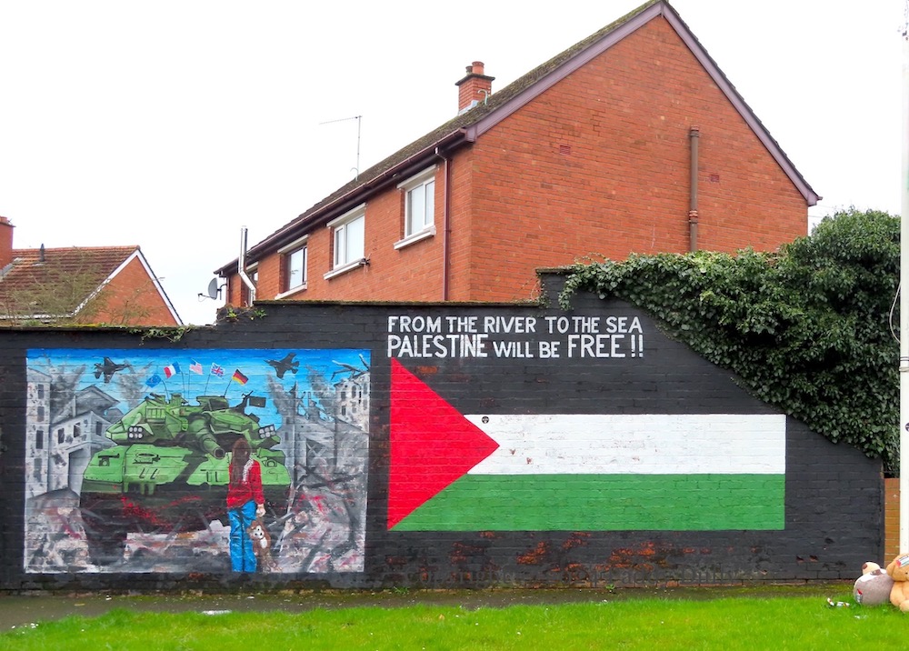The F-16 jets and rubble and child with teddy-bear are the same as in the We Stand With Palestine mural in Ardoyne.